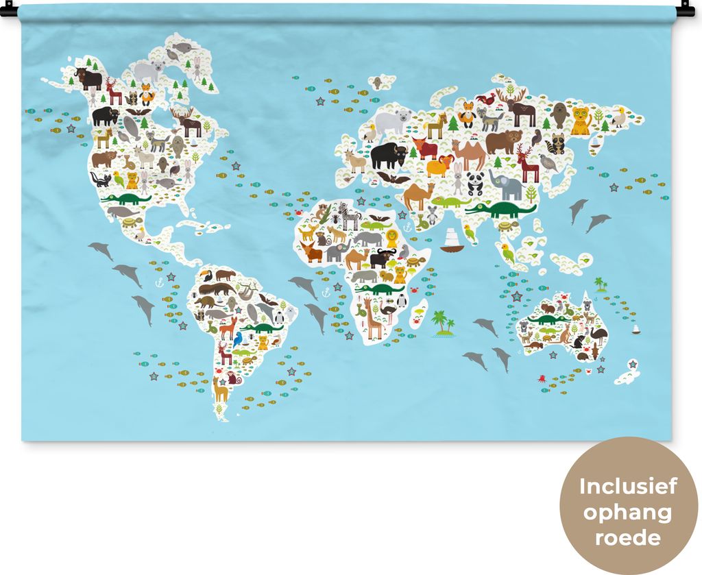 MuchoWow Wandteppich Wandbehang Weltkarte - Kinder - Tiere - Blau - Jungen - Mädchen 120x80 cm Tapisserie Dekoration Wandtuch - Wanddekorationen...
