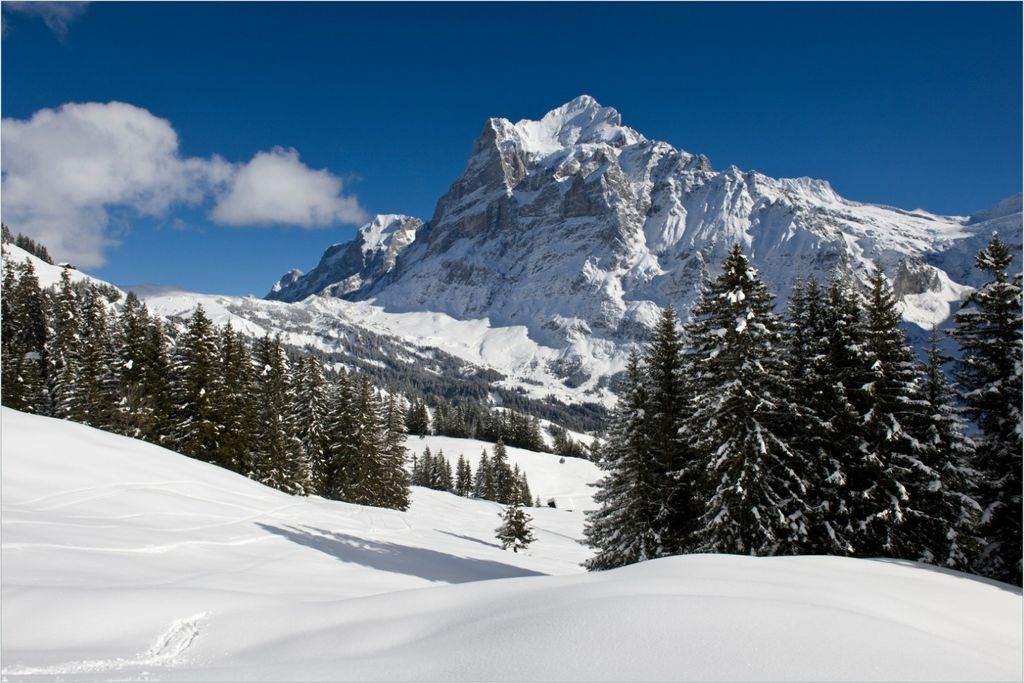 Wallario selbstklebendes Poster - Verschneiter Berghang unter blauem Himmel, Größe: 100 x 150 cm