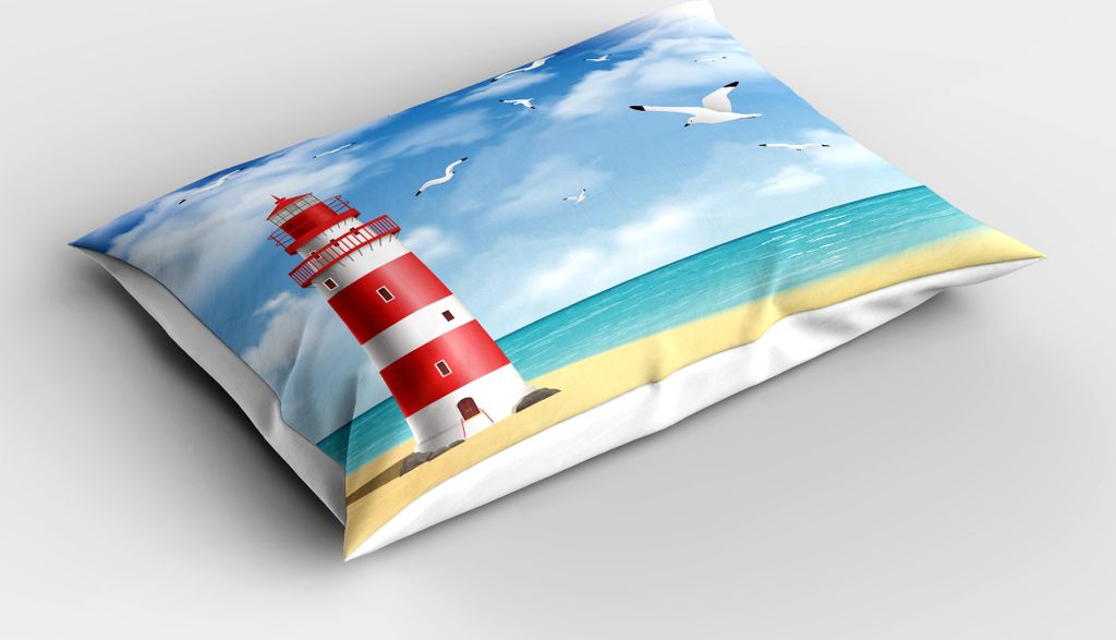 ABAKUHAUS Strand Kopfkissenbezug, Realistischer Illustration Leuchtturm Ruhiger Küste die Seemöwen Ozean Landschaft, 40x80 cm, Vermilion Blau