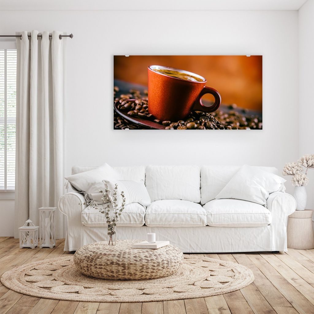 Glasbild Wandbild Kaffee auf Bohnen 60x30cm in XXL für Wohnzimmer, Schlafzimmer, Badezimmer, Flur