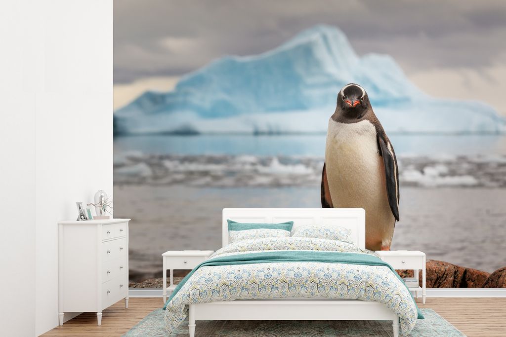 MuchoWow Fototapete für Wohnzimmer oder Schlafzimmer Wandtapete Vinyl Motivtapete Ein Pinguin auf einem Felsen - 360x260 cm - Wohnzimmer tapete