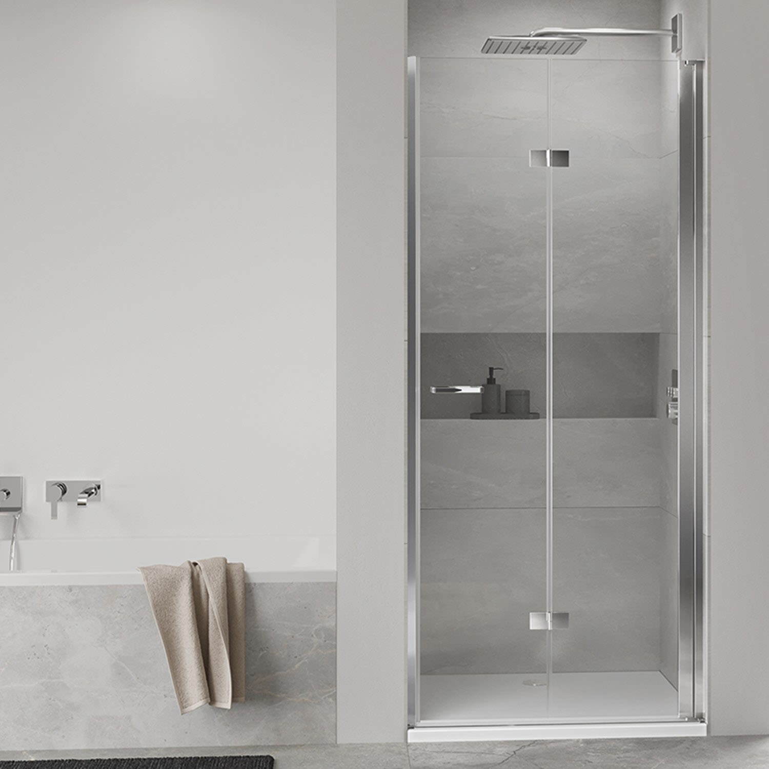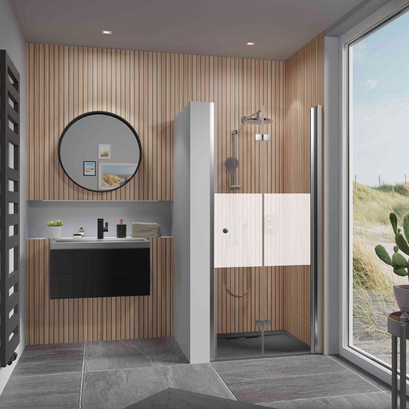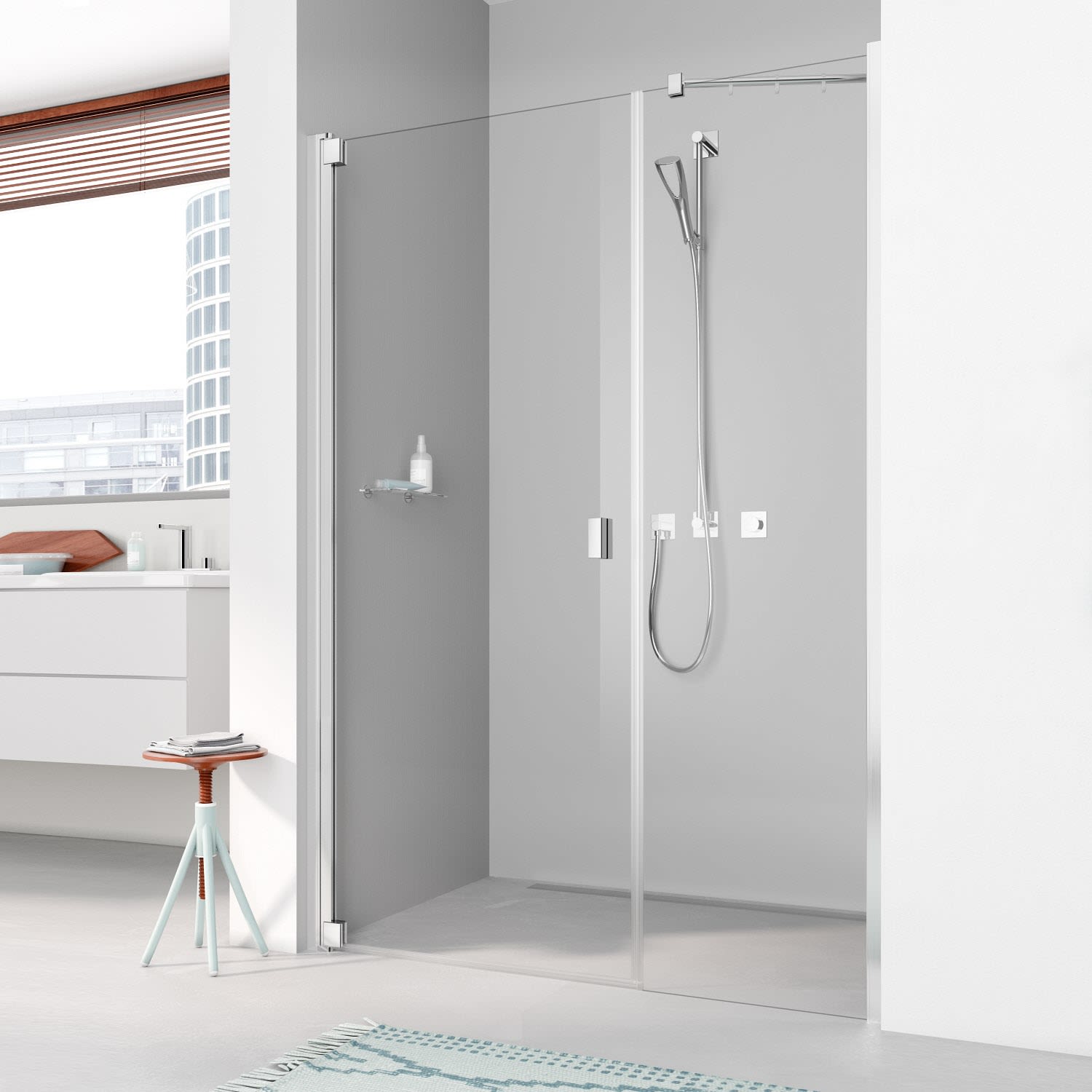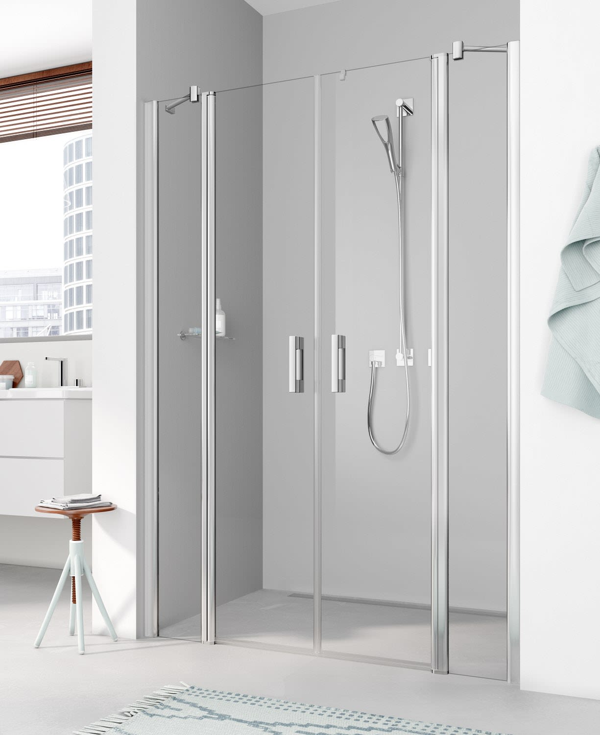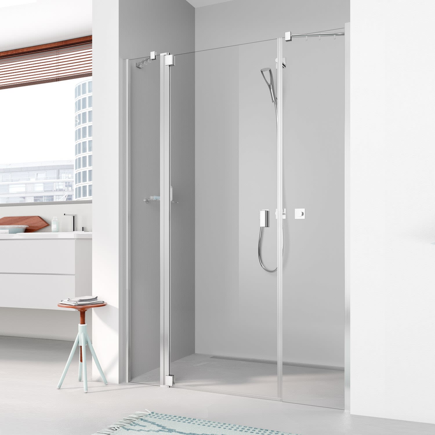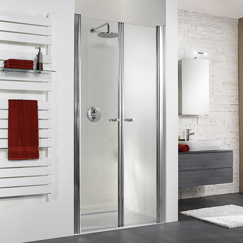 HSK teilgerahmte Drehfalttür pendelbar „Exklusiv 2.0“ für Seitenwand Glas Nebel, Profile Chromoptik (Alu Hochglanz poliert), Scharniere Premium