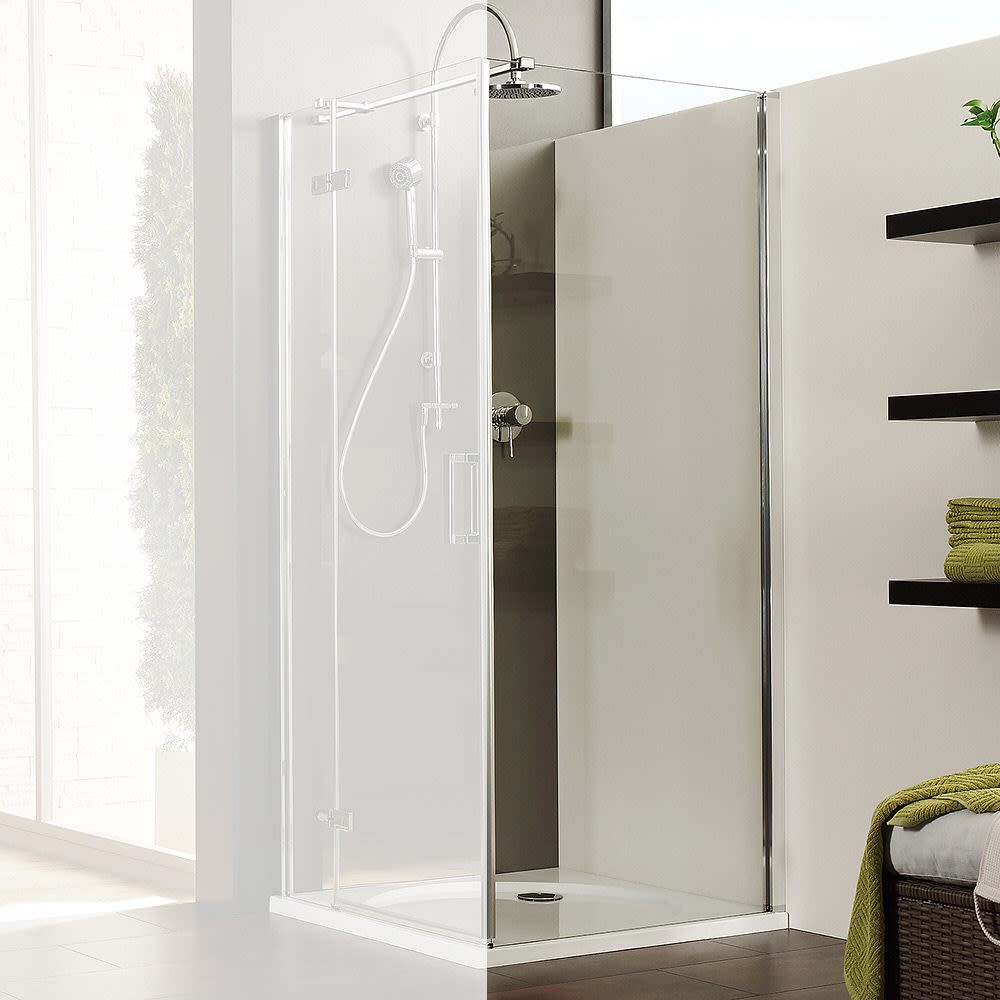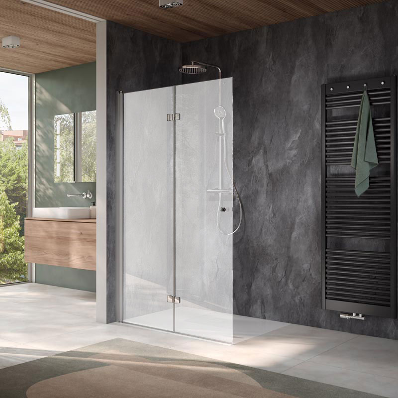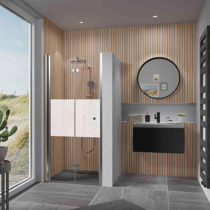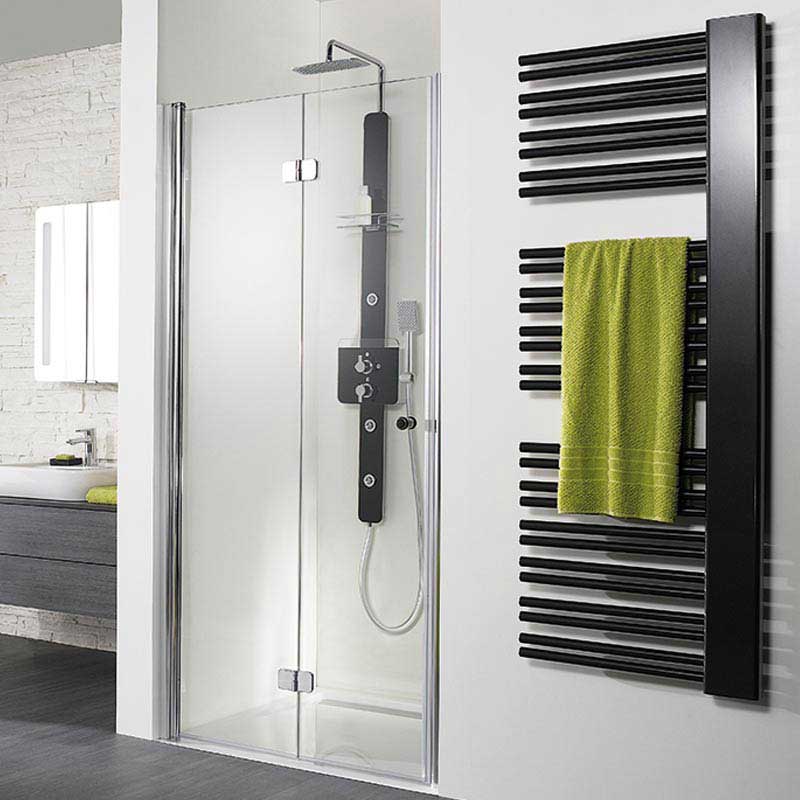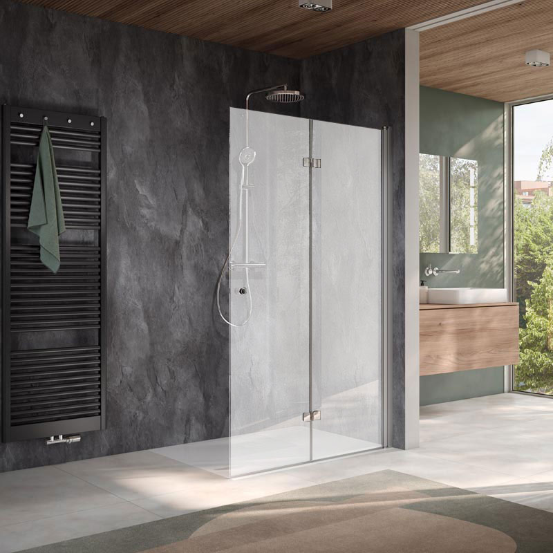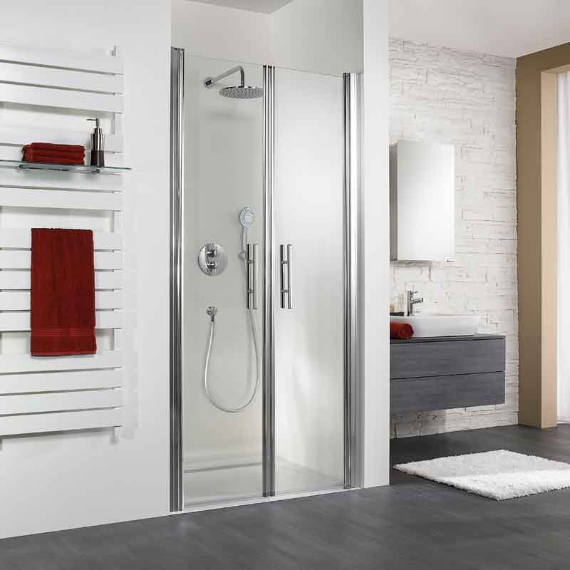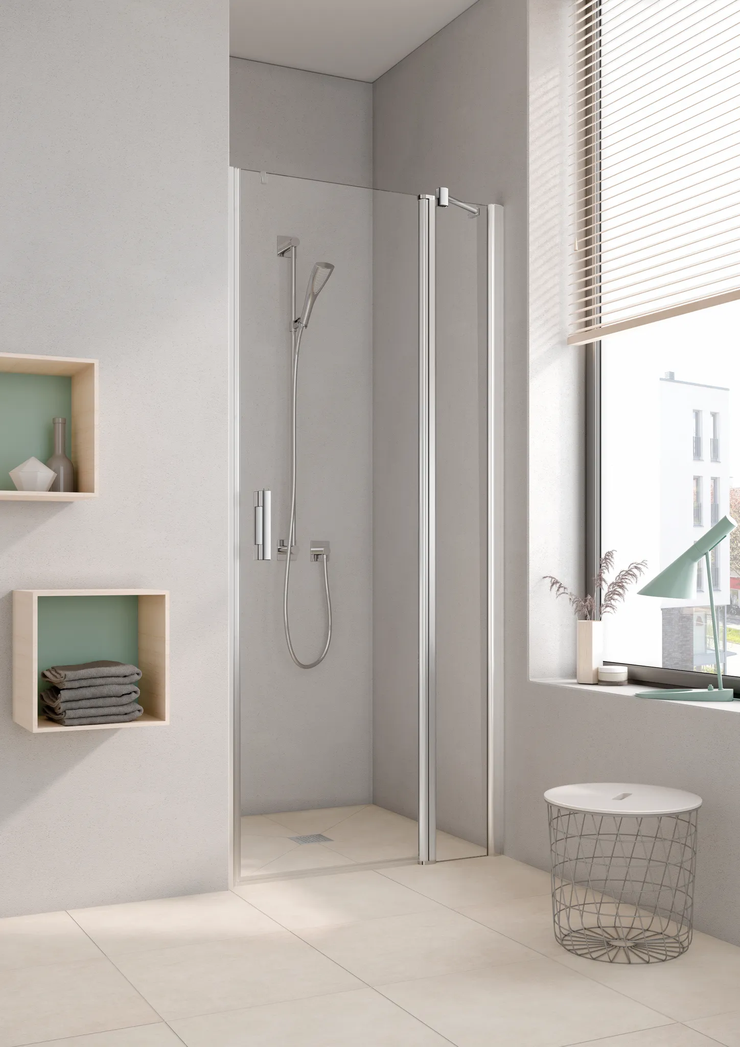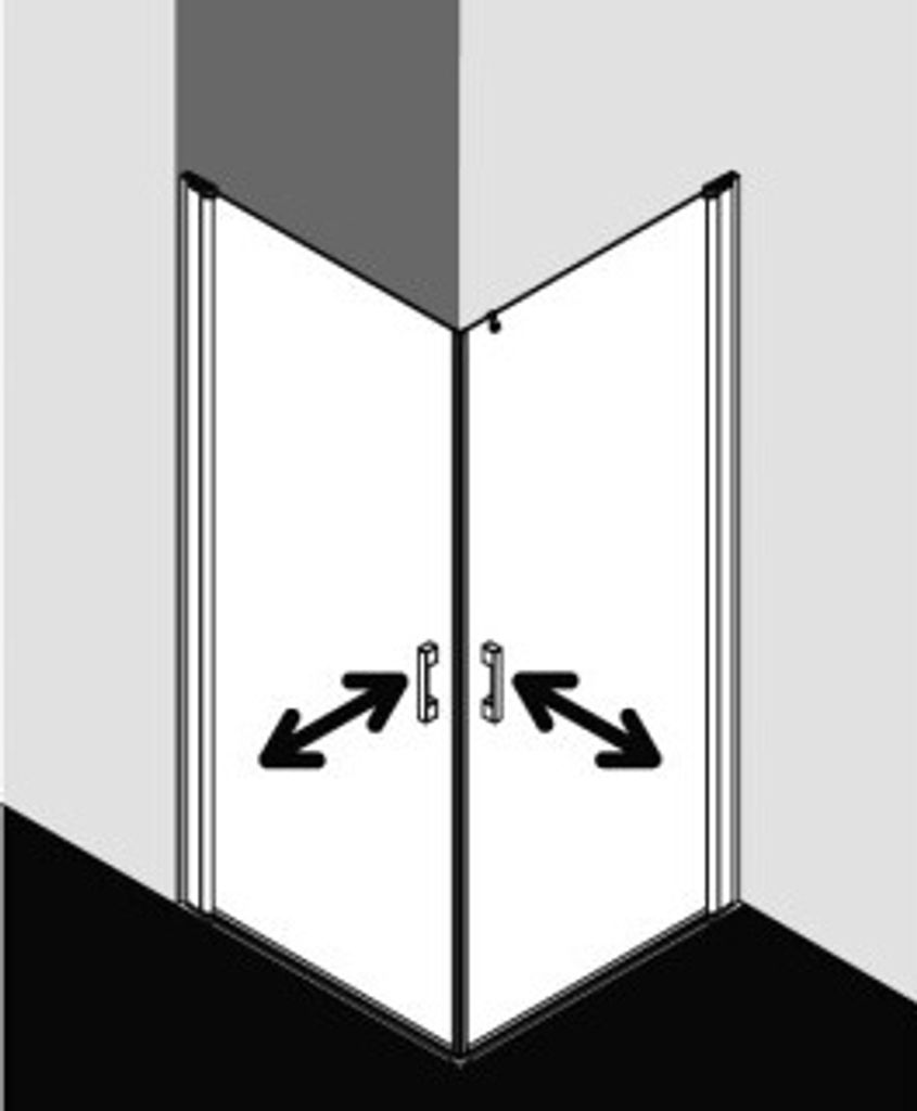 HSK teilgerahmte Drehfalttür pendelbar „Exklusiv 2.0“ für Seitenwand Glas Nebel, Profile Chromoptik (Alu Hochglanz poliert), Scharniere Premium