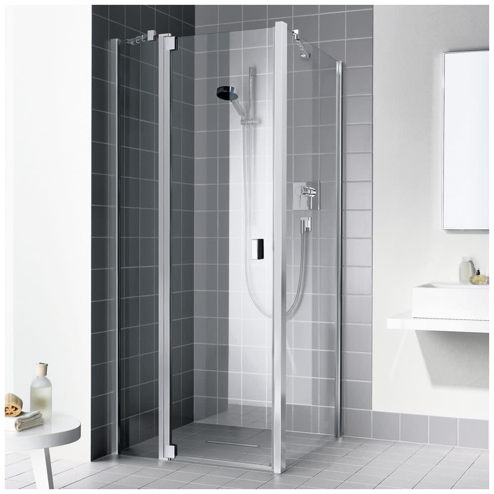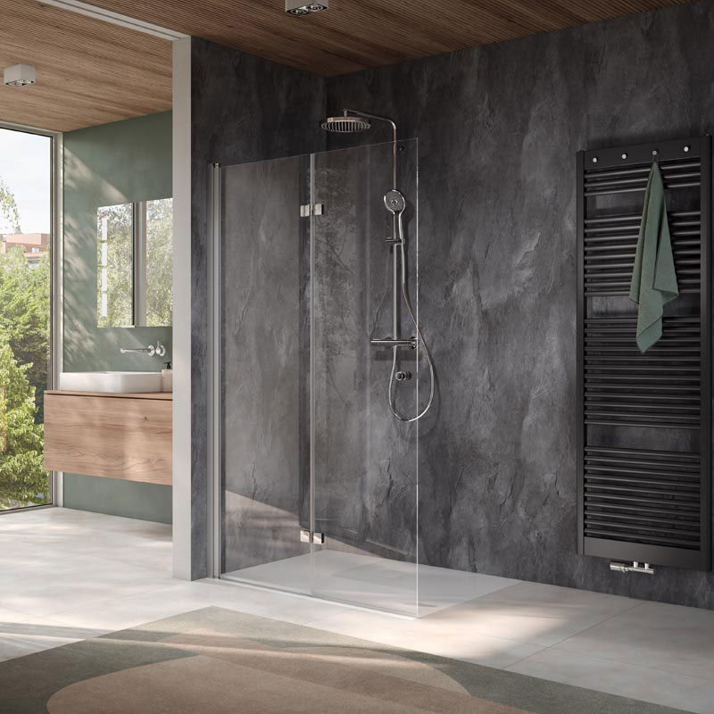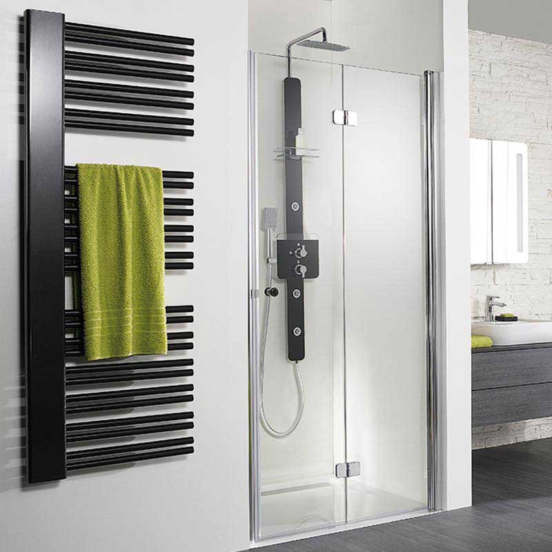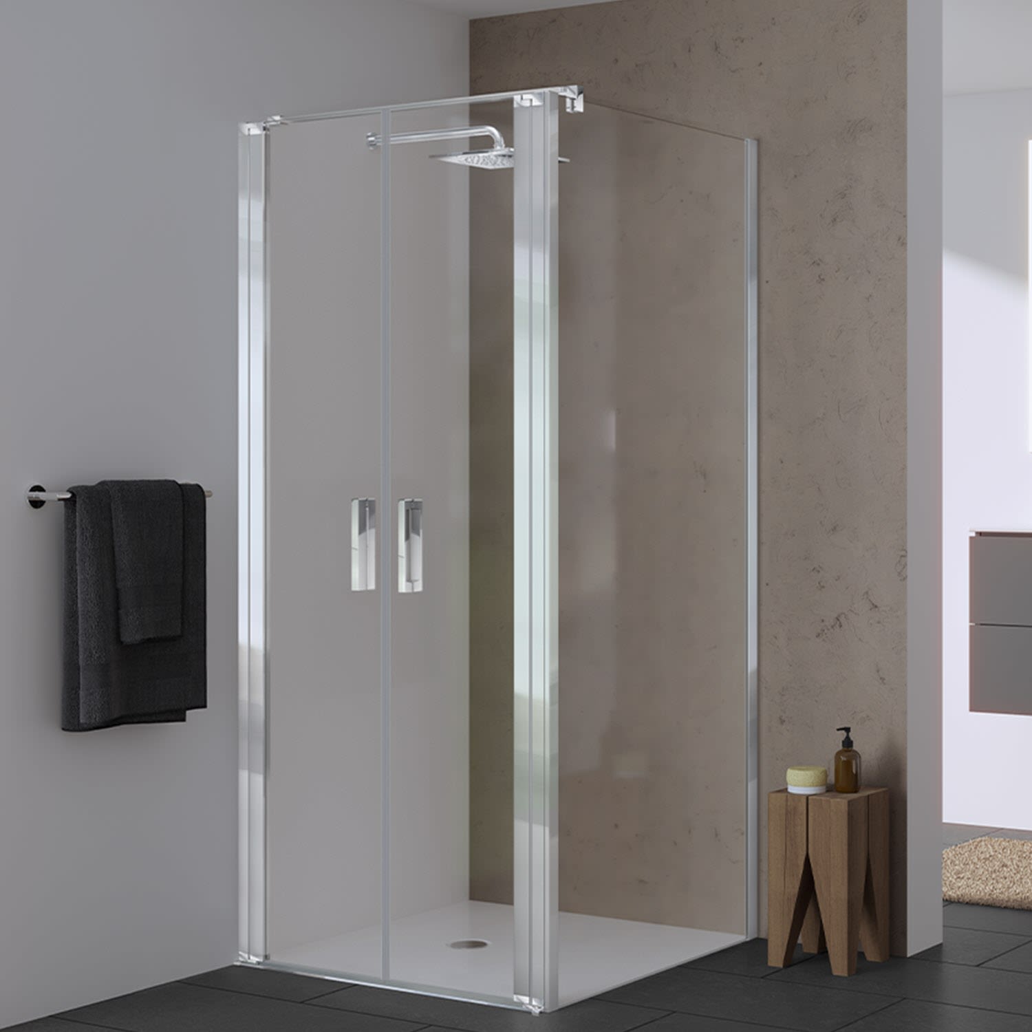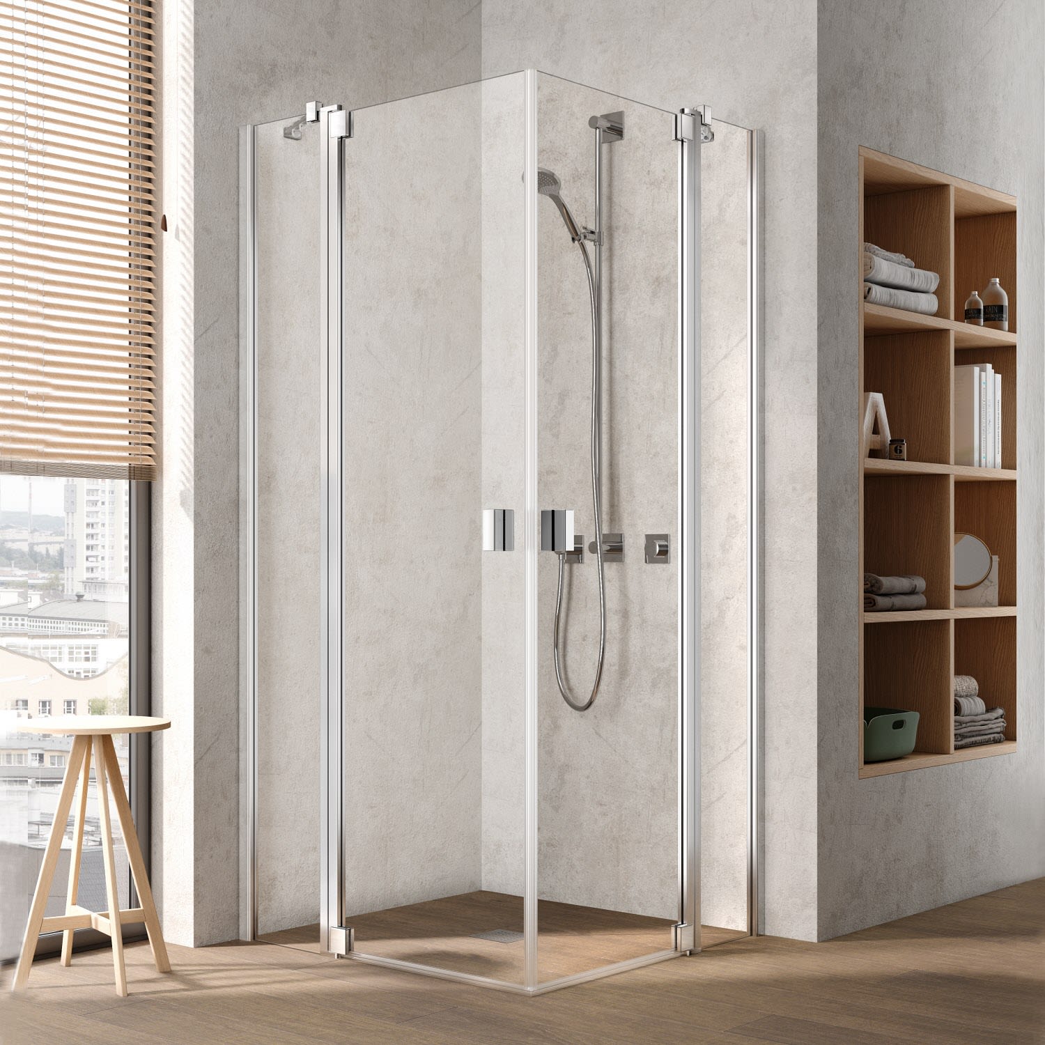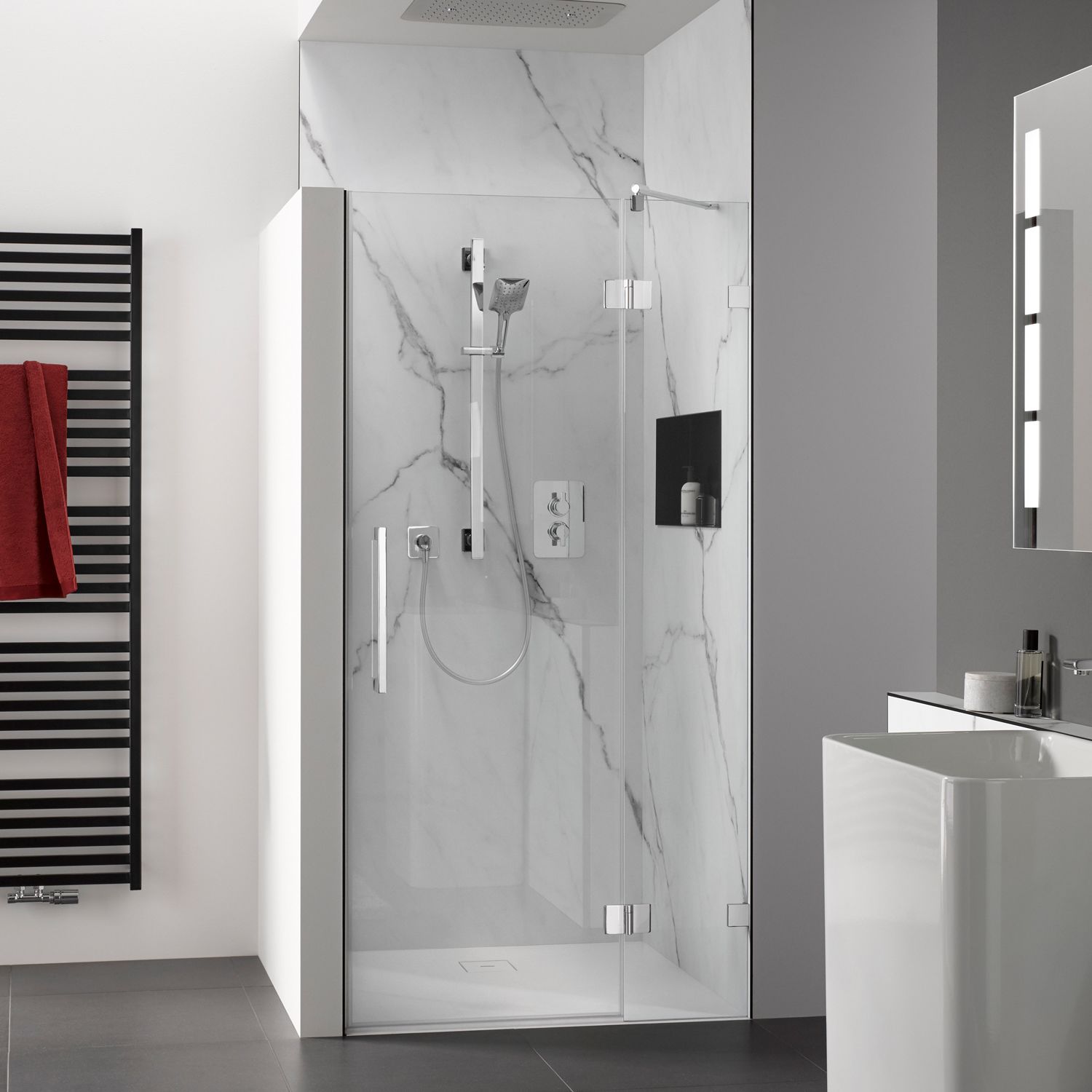 HSK teilgerahmte Drehfalttür pendelbar „Exklusiv 2.0“ für Seitenwand Glas Nebel, Profile Chromoptik (Alu Hochglanz poliert), Scharniere Premium