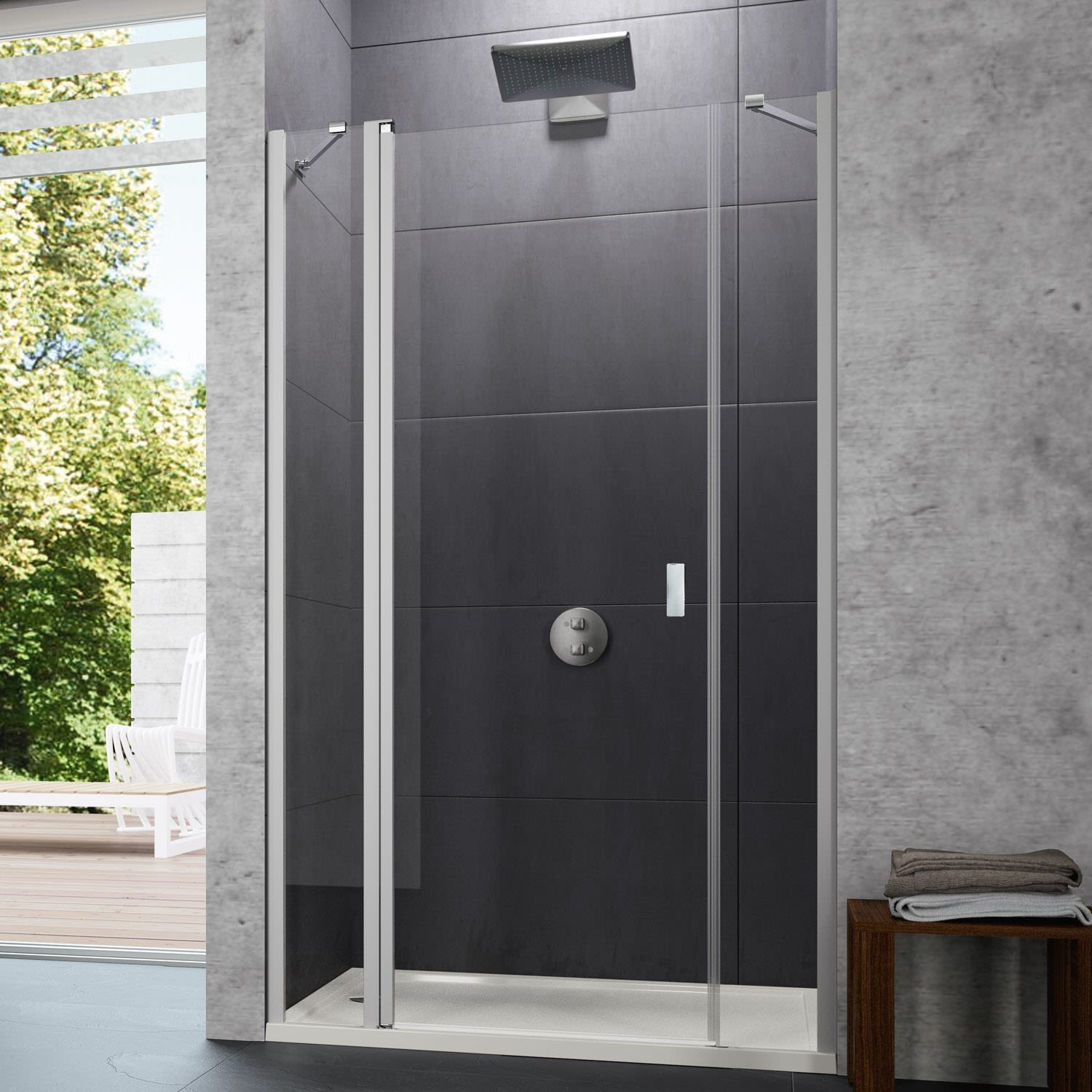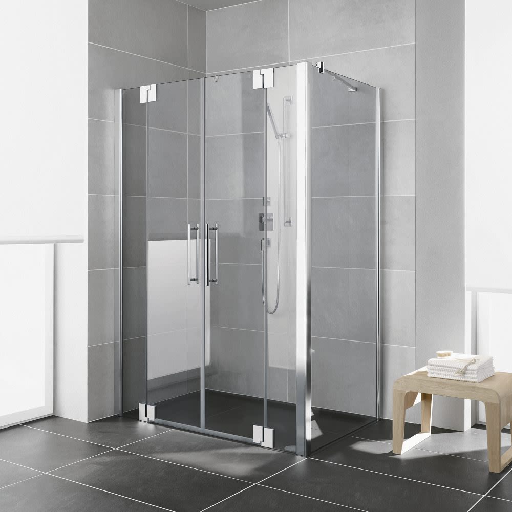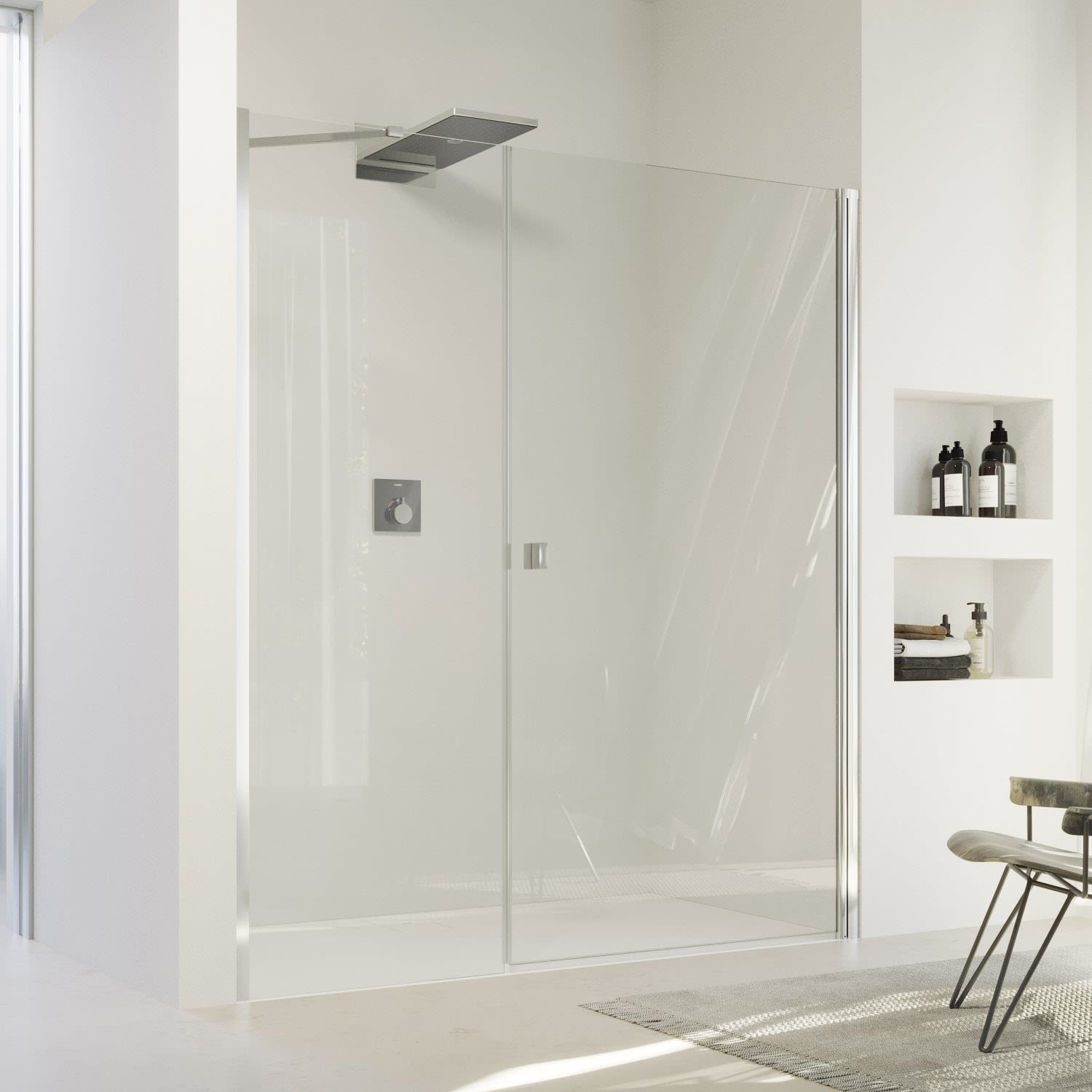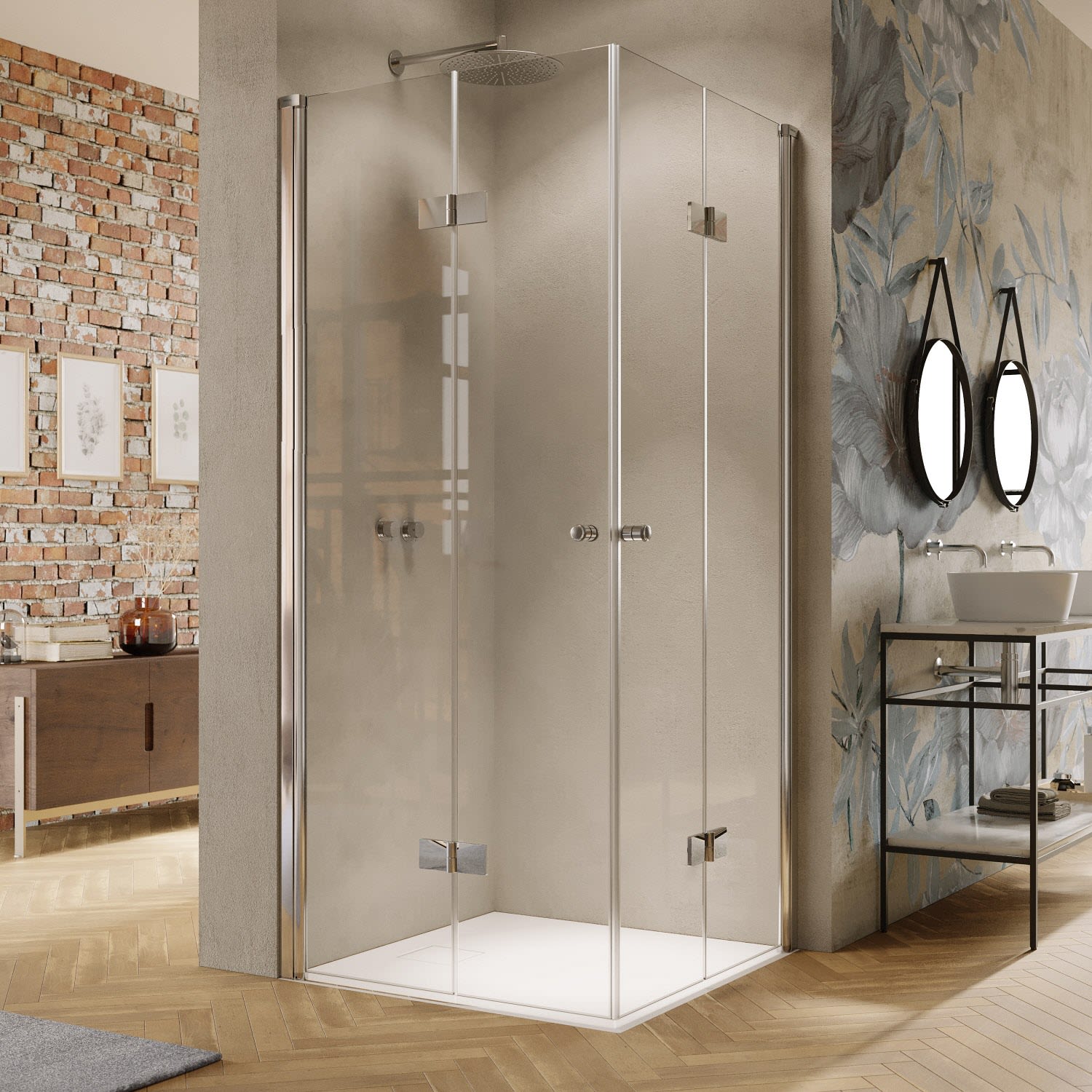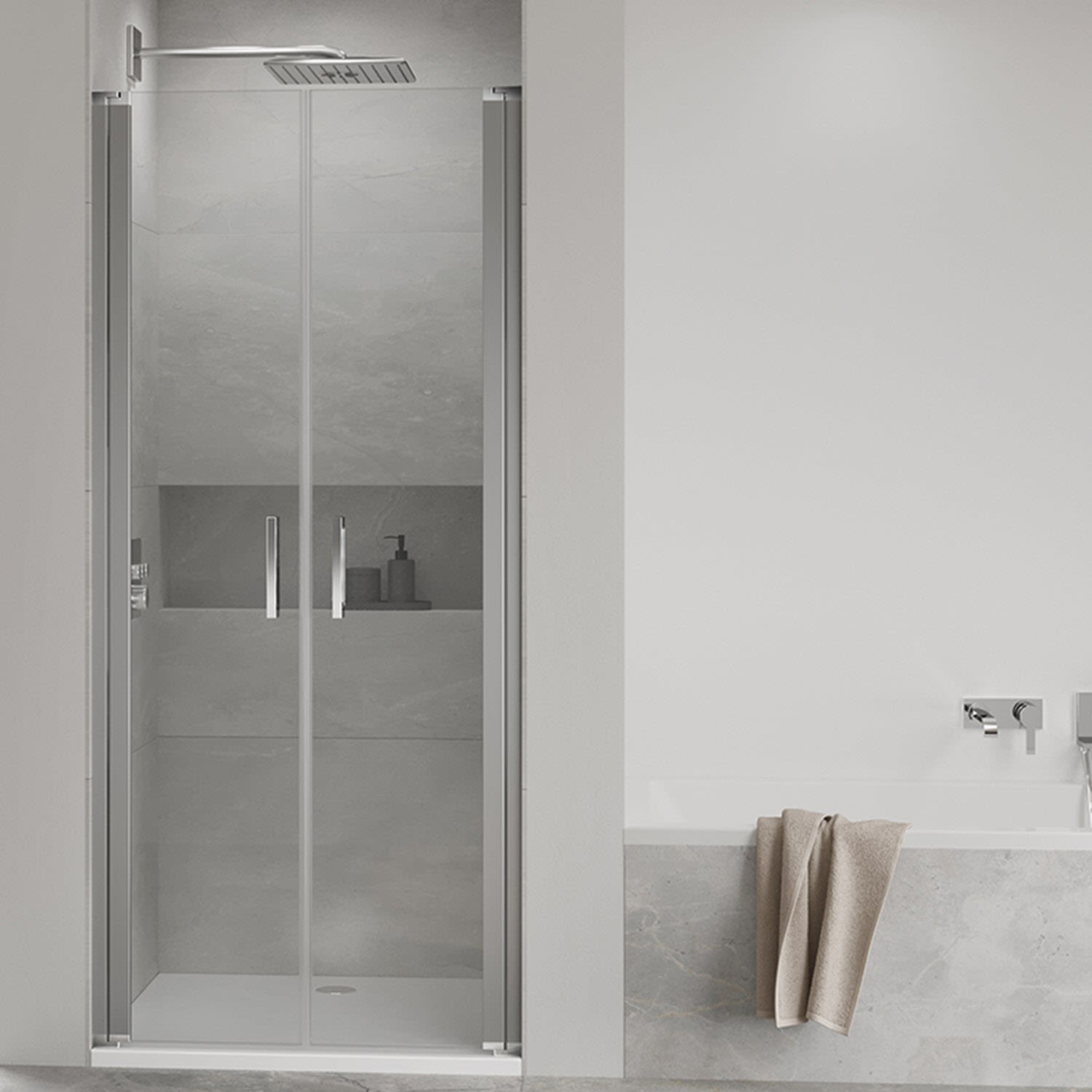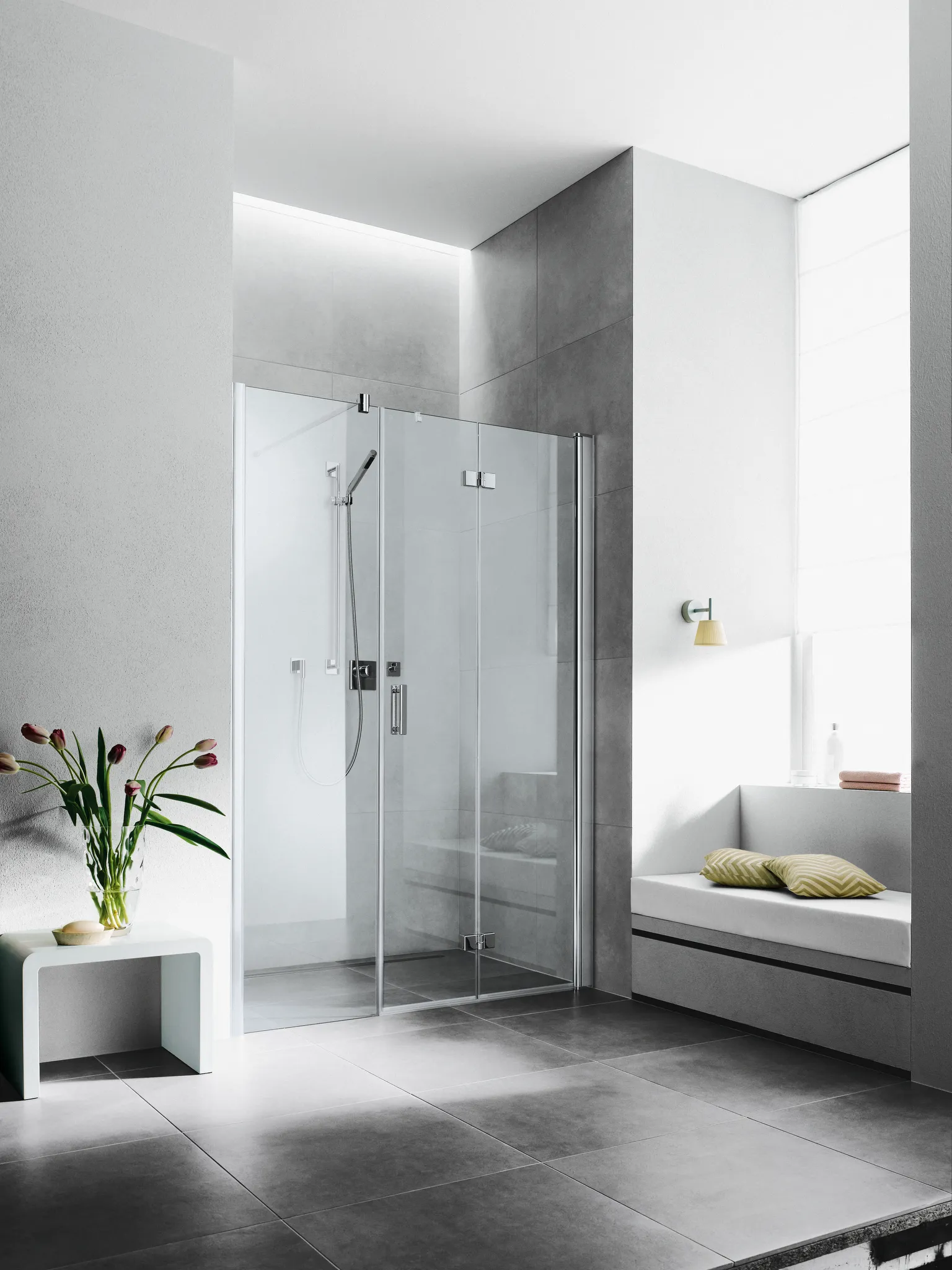 HSK teilgerahmte Drehfalttür pendelbar „Exklusiv 2.0“ für Seitenwand Glas Nebel, Profile Chromoptik (Alu Hochglanz poliert), Scharniere Premium