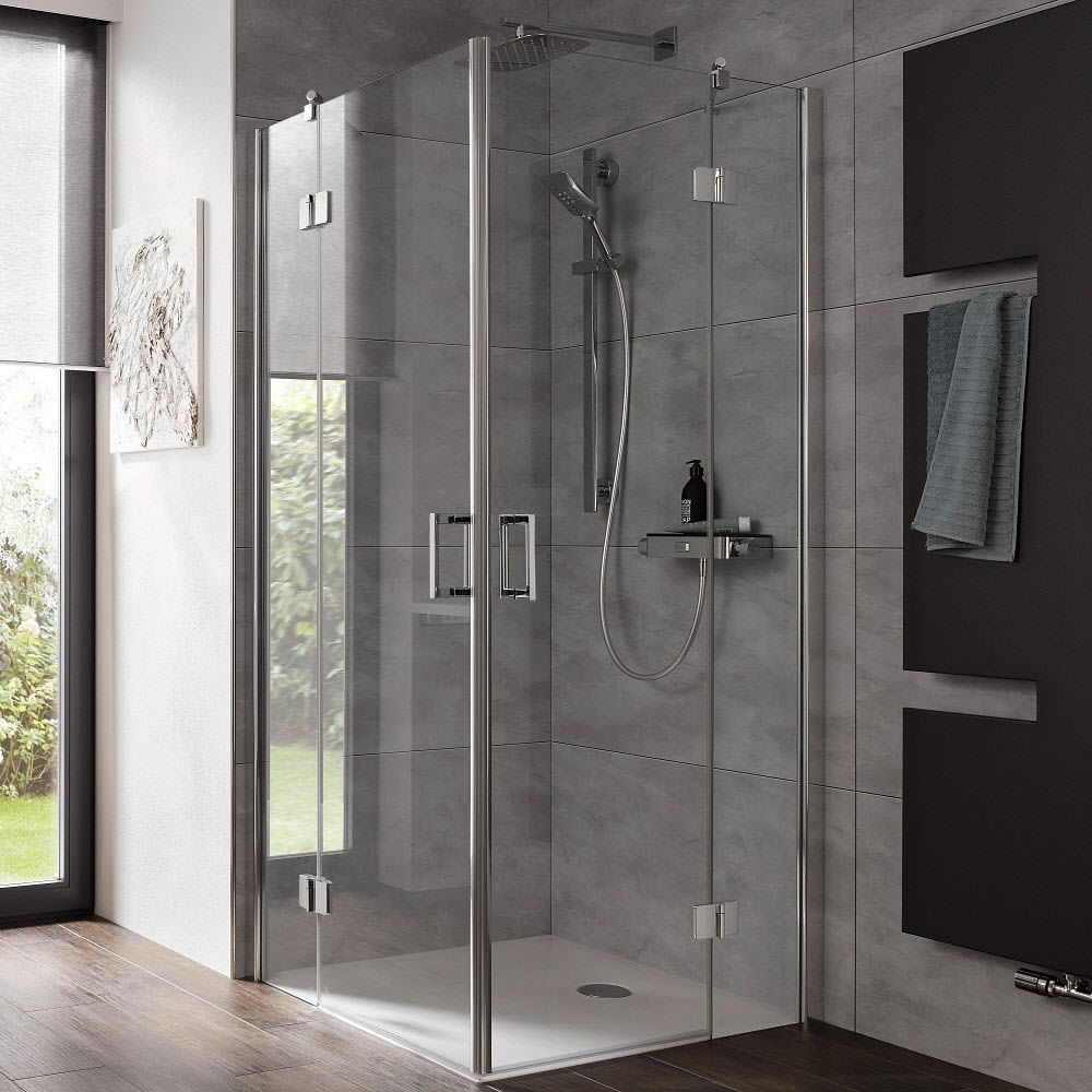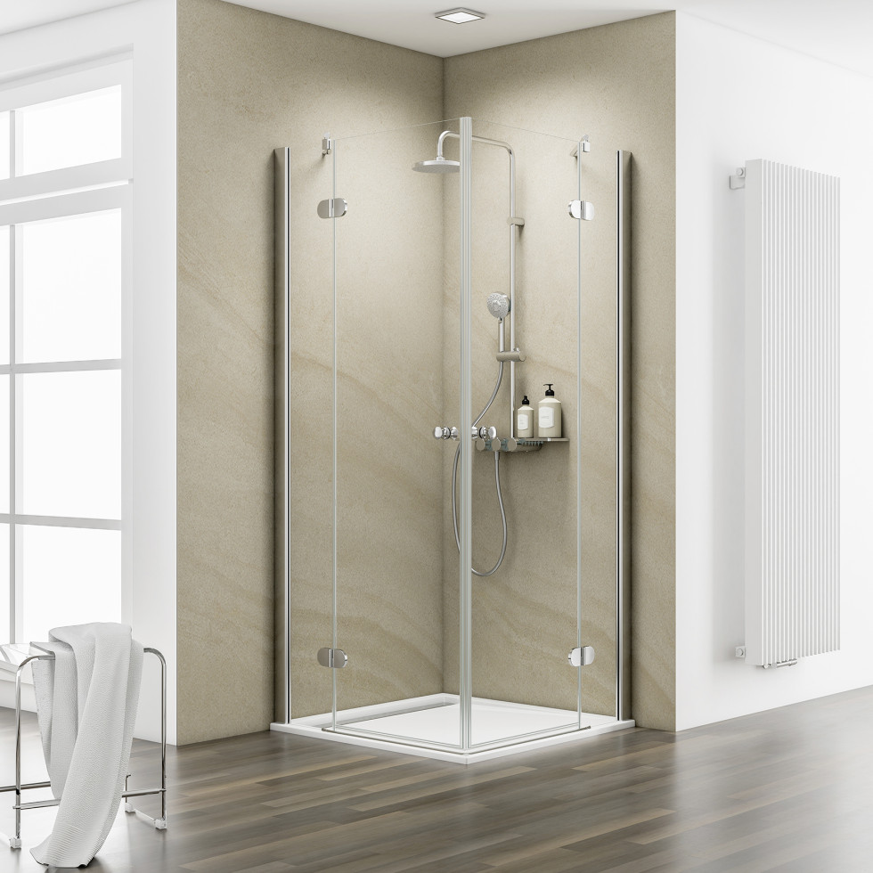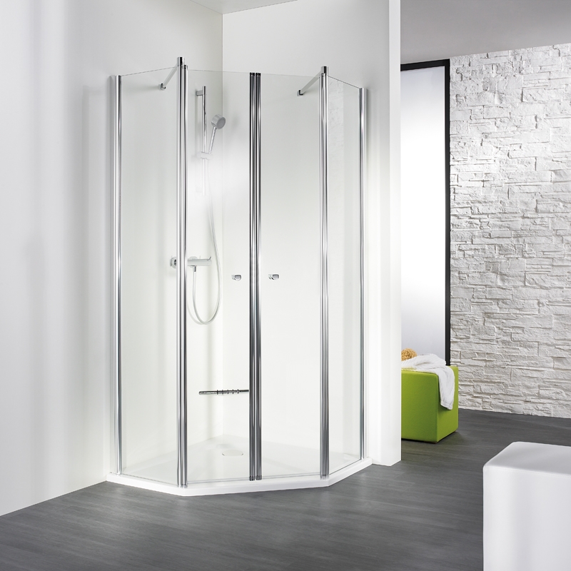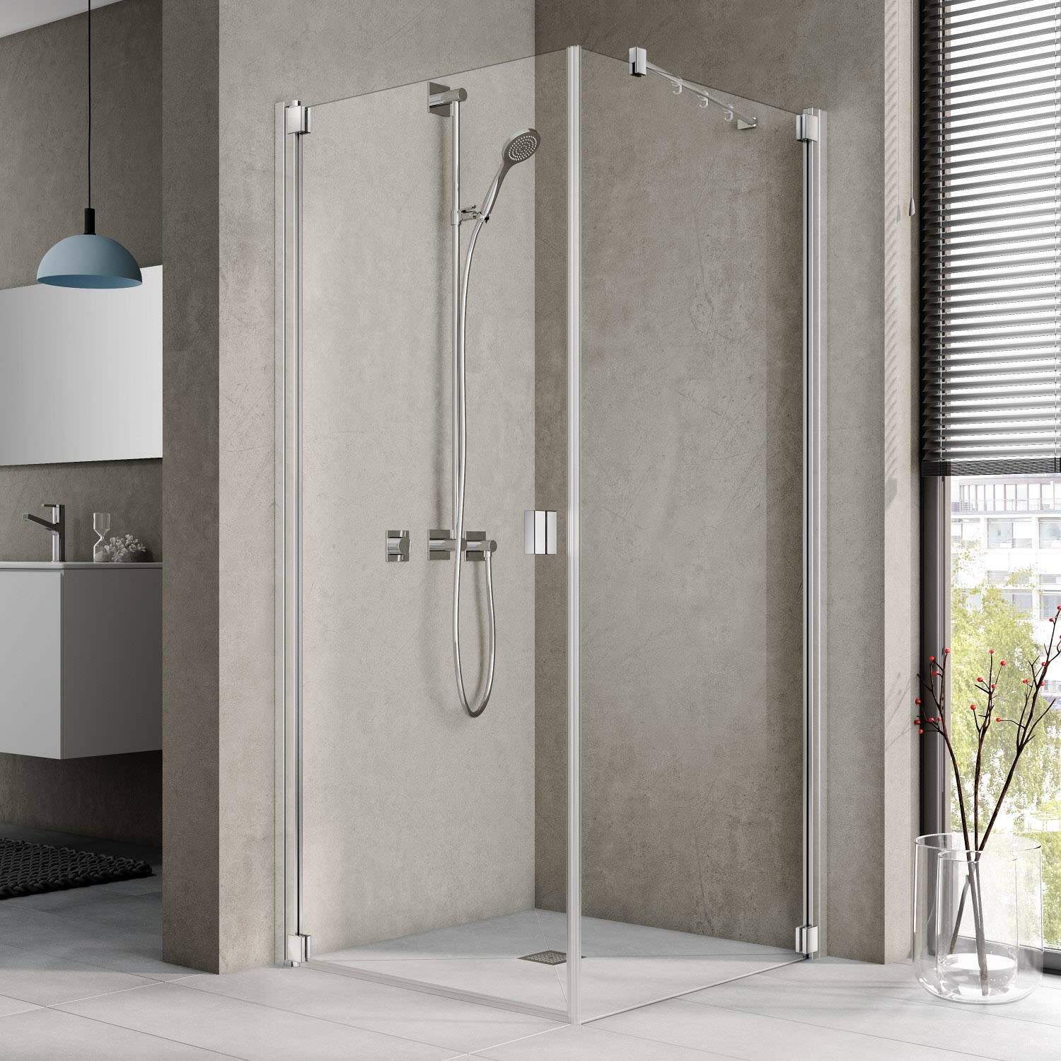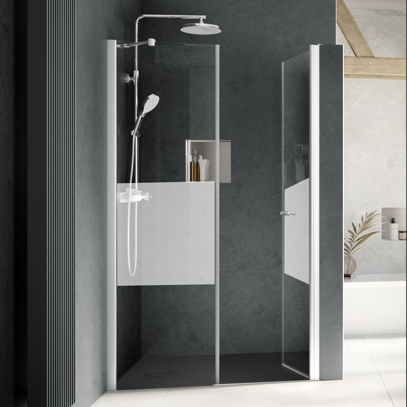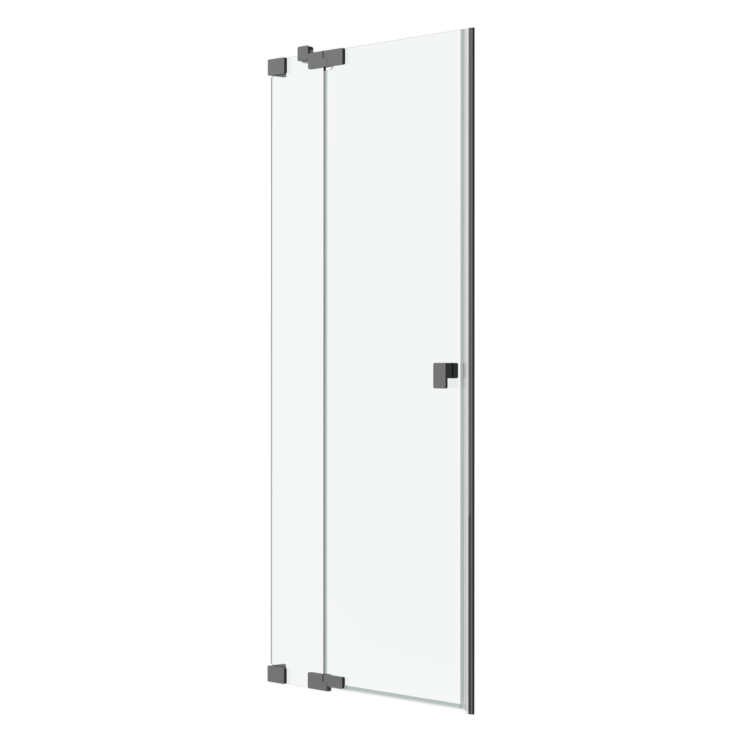 HSK teilgerahmte Drehfalttür pendelbar „Exklusiv 2.0“ für Seitenwand Glas Nebel, Profile Chromoptik (Alu Hochglanz poliert), Scharniere Premium