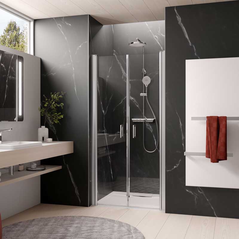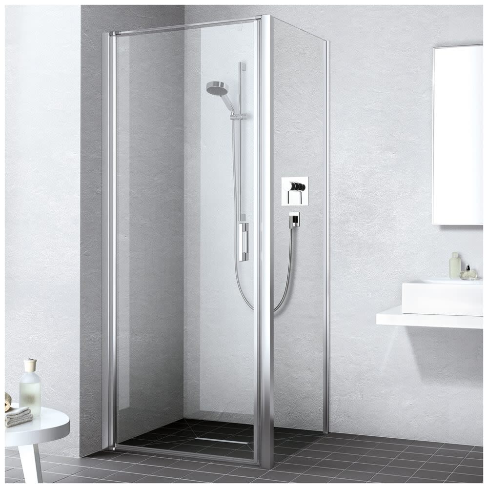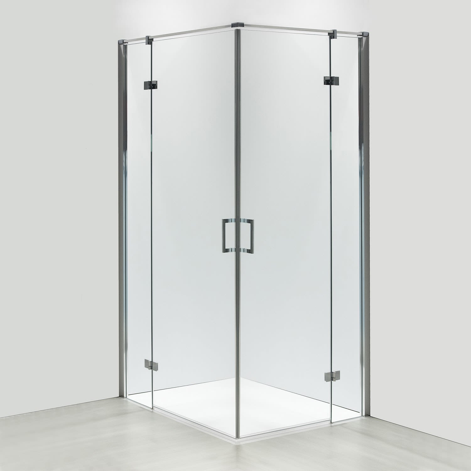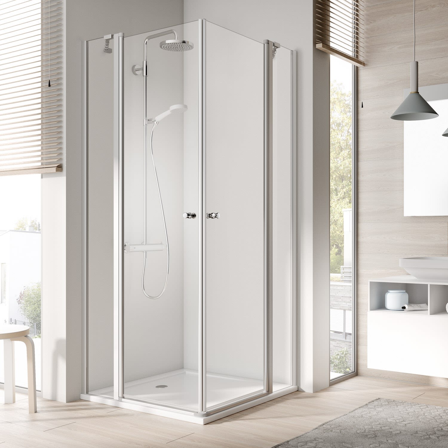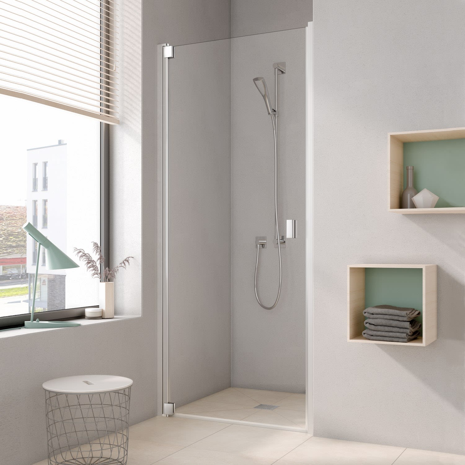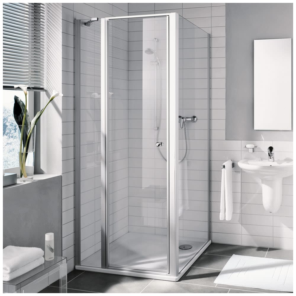 HSK teilgerahmte Drehfalttür pendelbar „Exklusiv 2.0“ für Seitenwand Glas Nebel, Profile Chromoptik (Alu Hochglanz poliert), Scharniere Premium