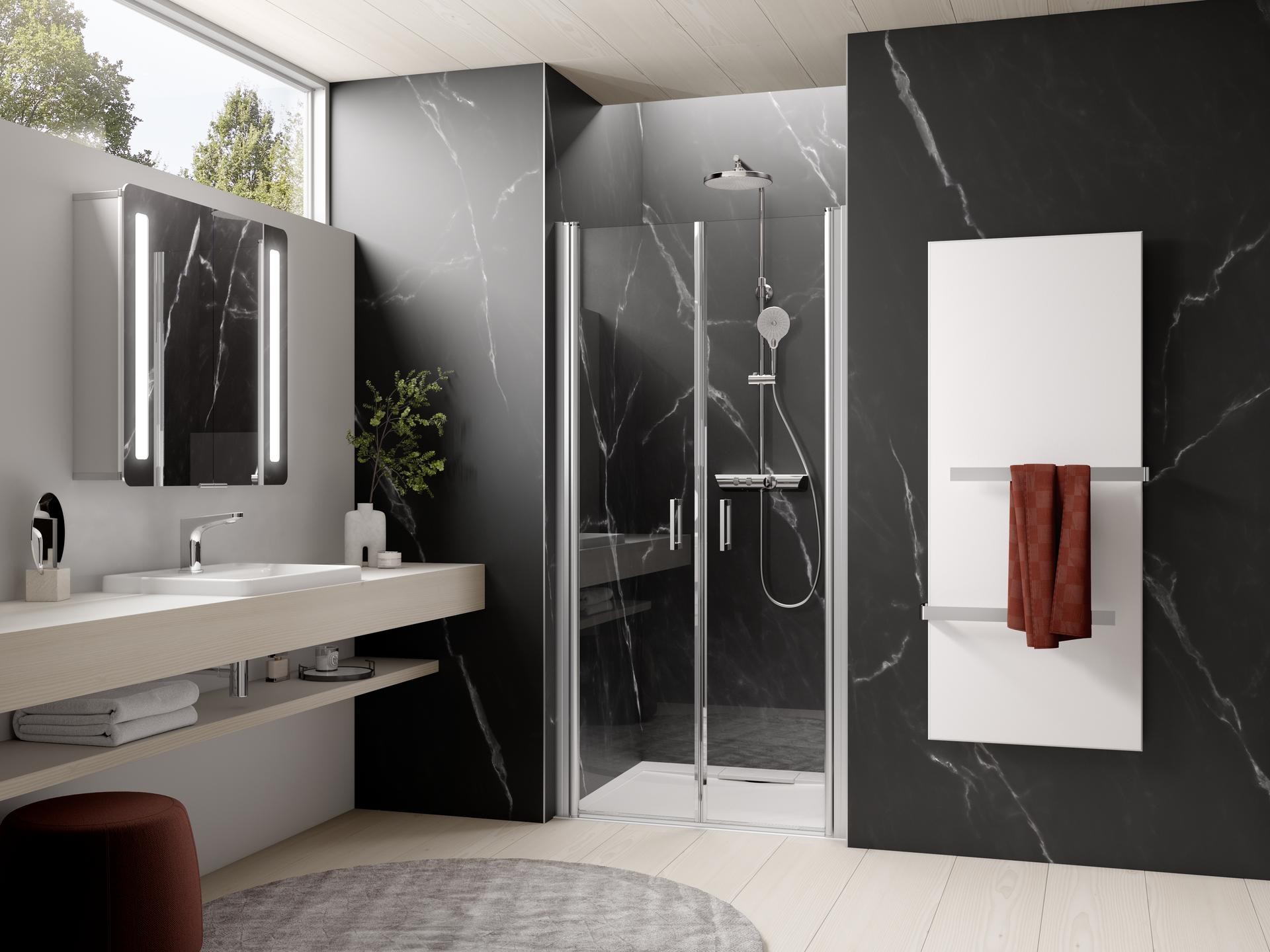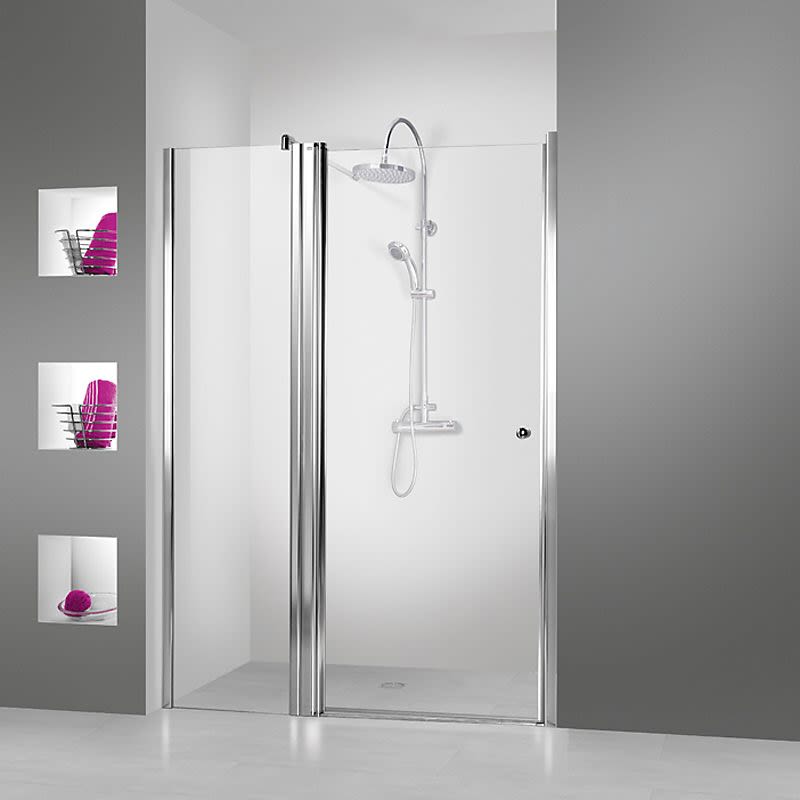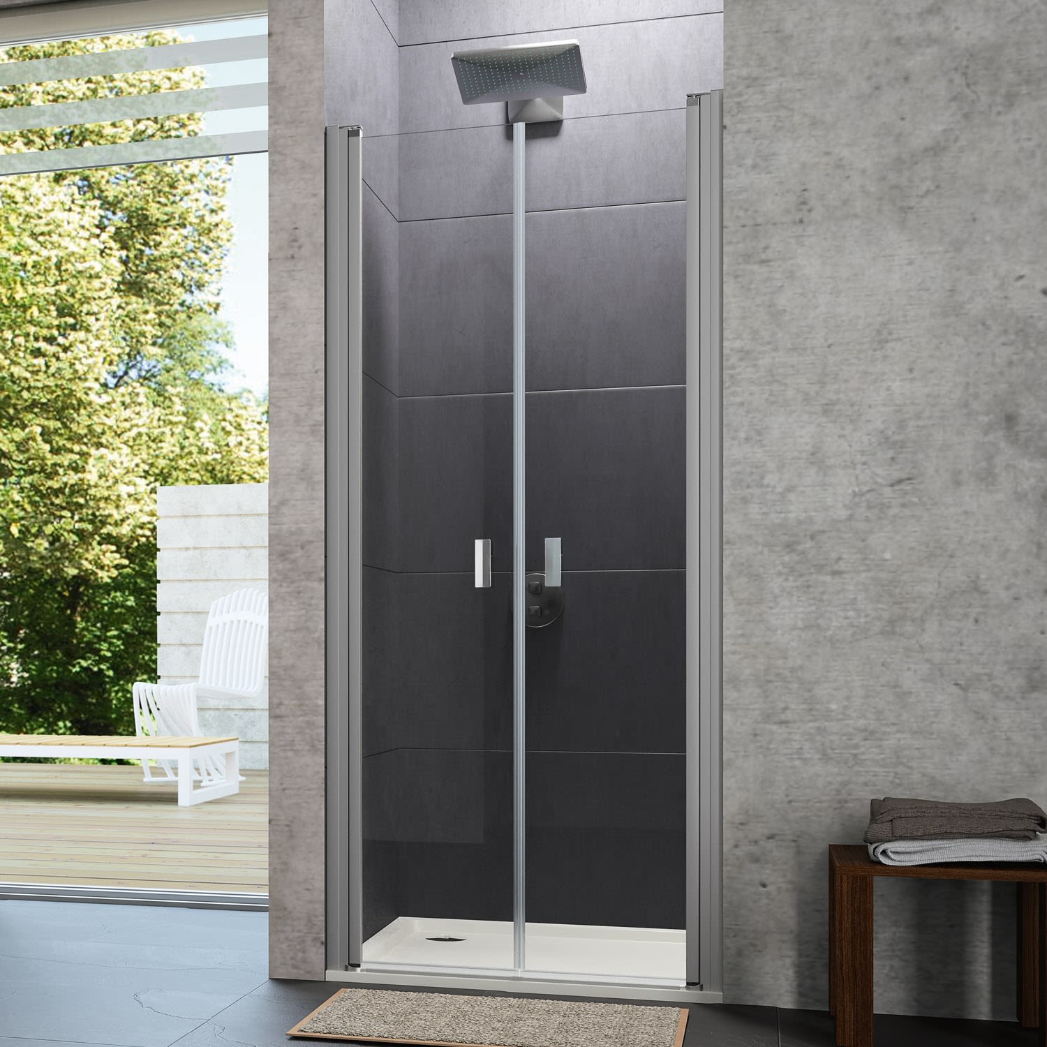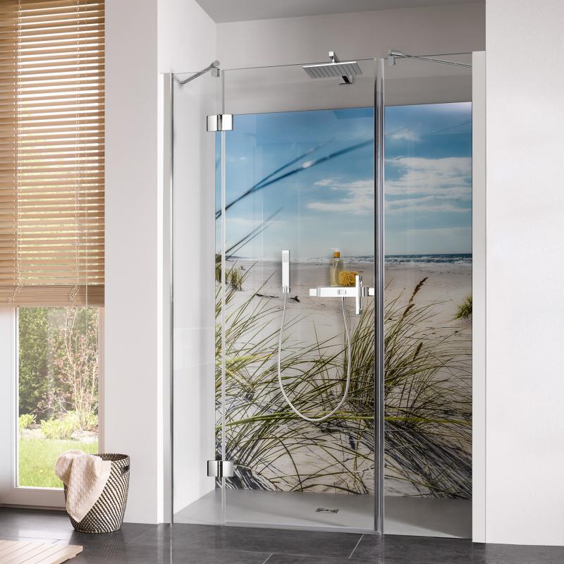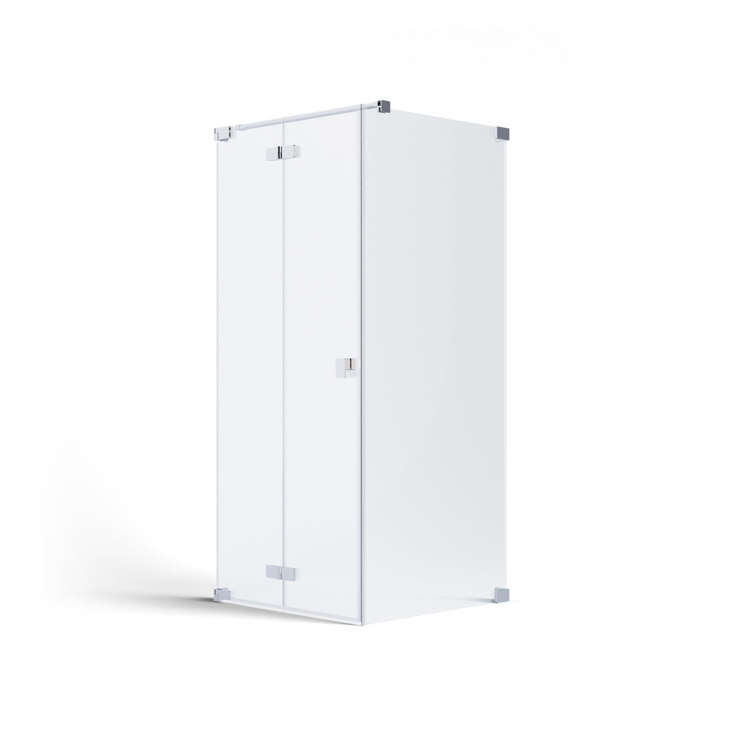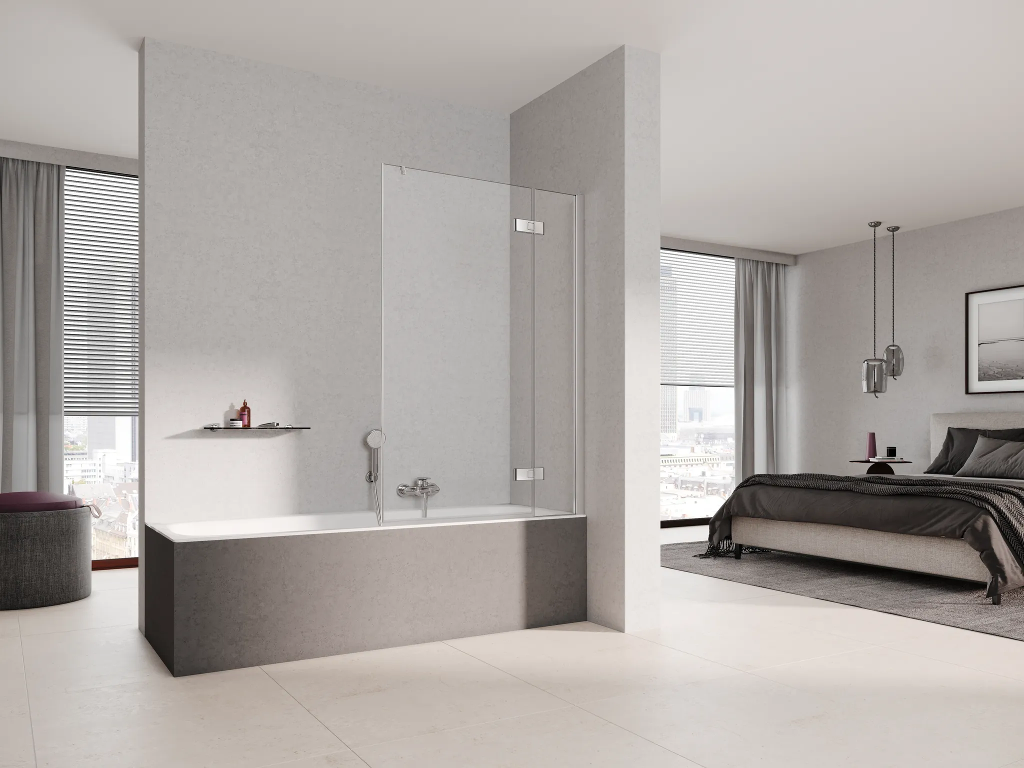HSK teilgerahmte Drehfalttür pendelbar „Exklusiv 2.0“ für Seitenwand Glas Nebel, Profile Chromoptik (Alu Hochglanz poliert), Scharniere Premium