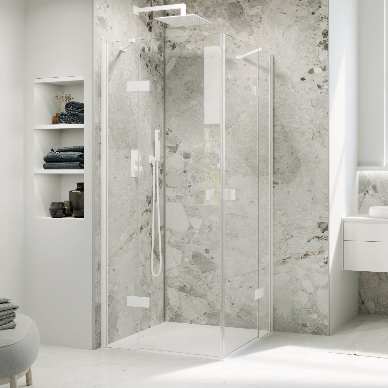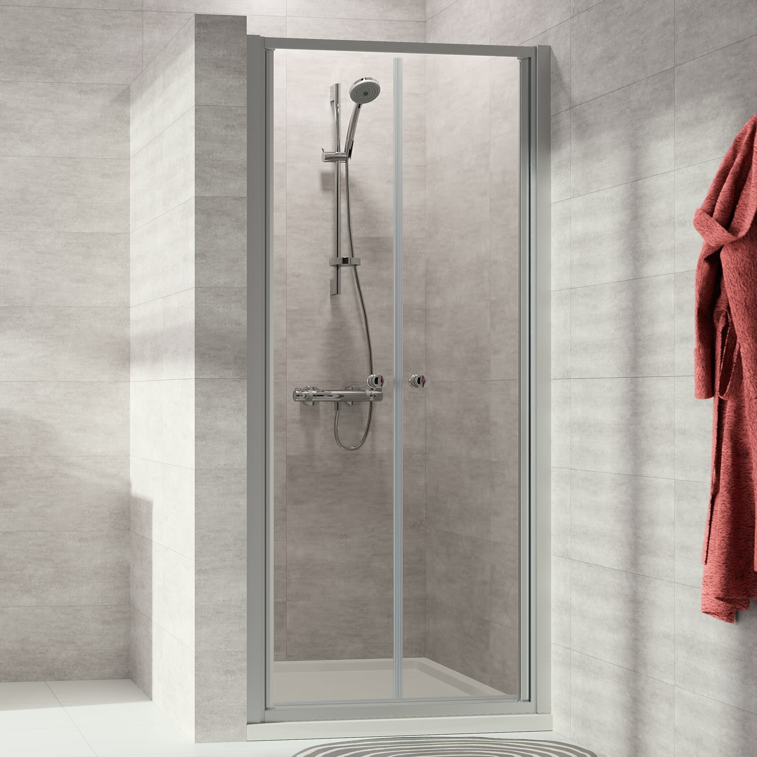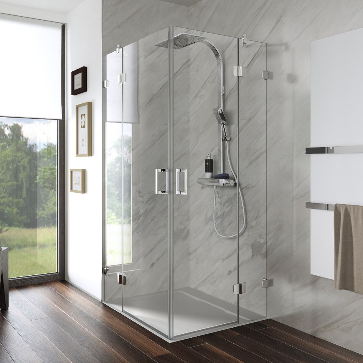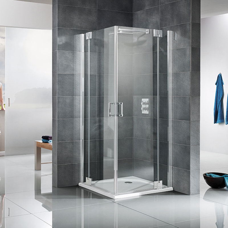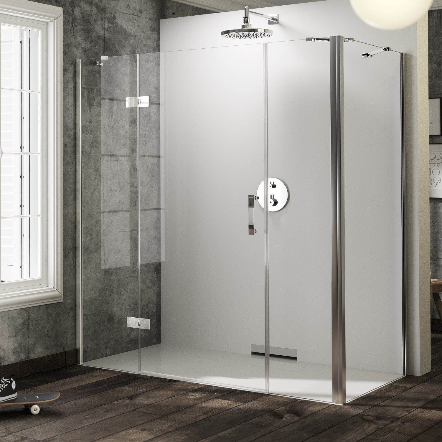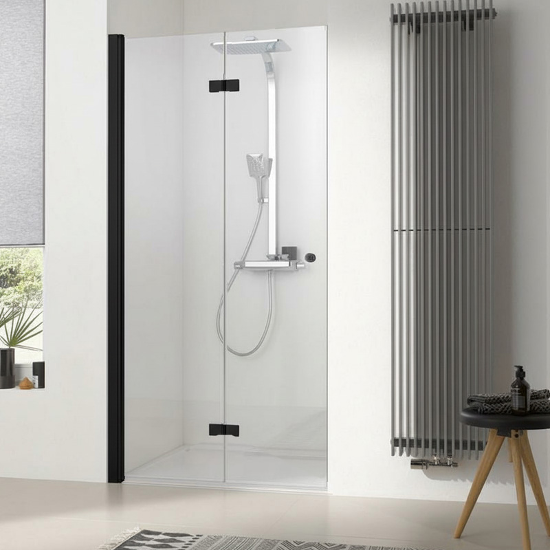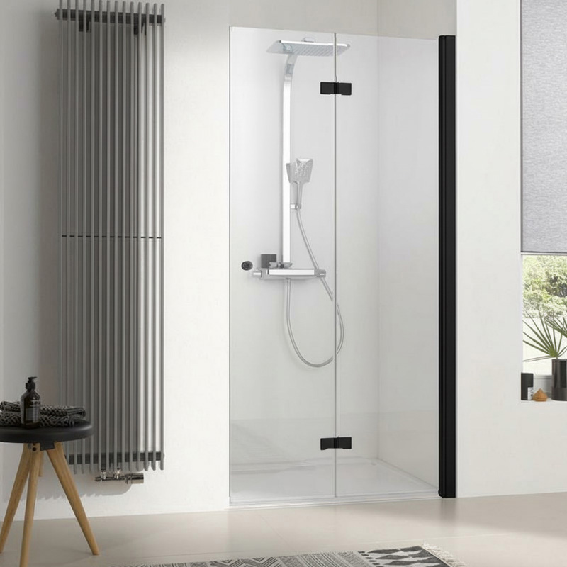 HSK teilgerahmte Drehfalttür pendelbar „Exklusiv 2.0“ für Seitenwand Glas Nebel, Profile Chromoptik (Alu Hochglanz poliert), Scharniere Premium
