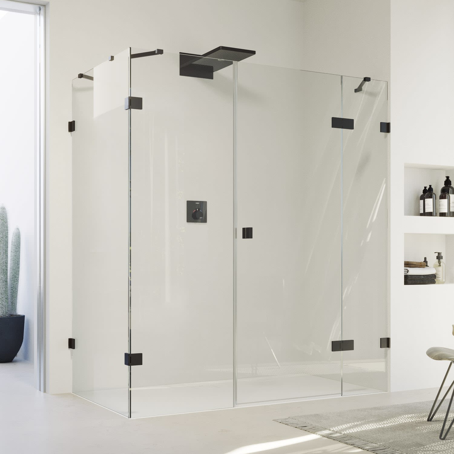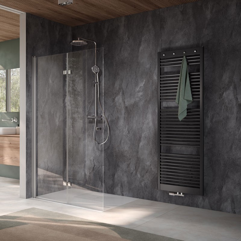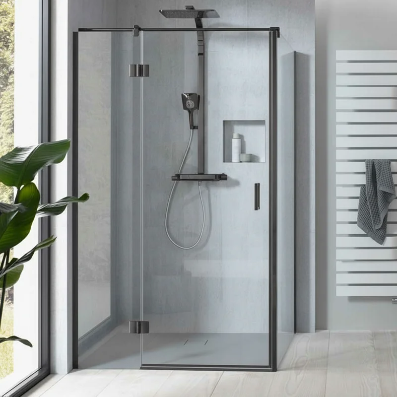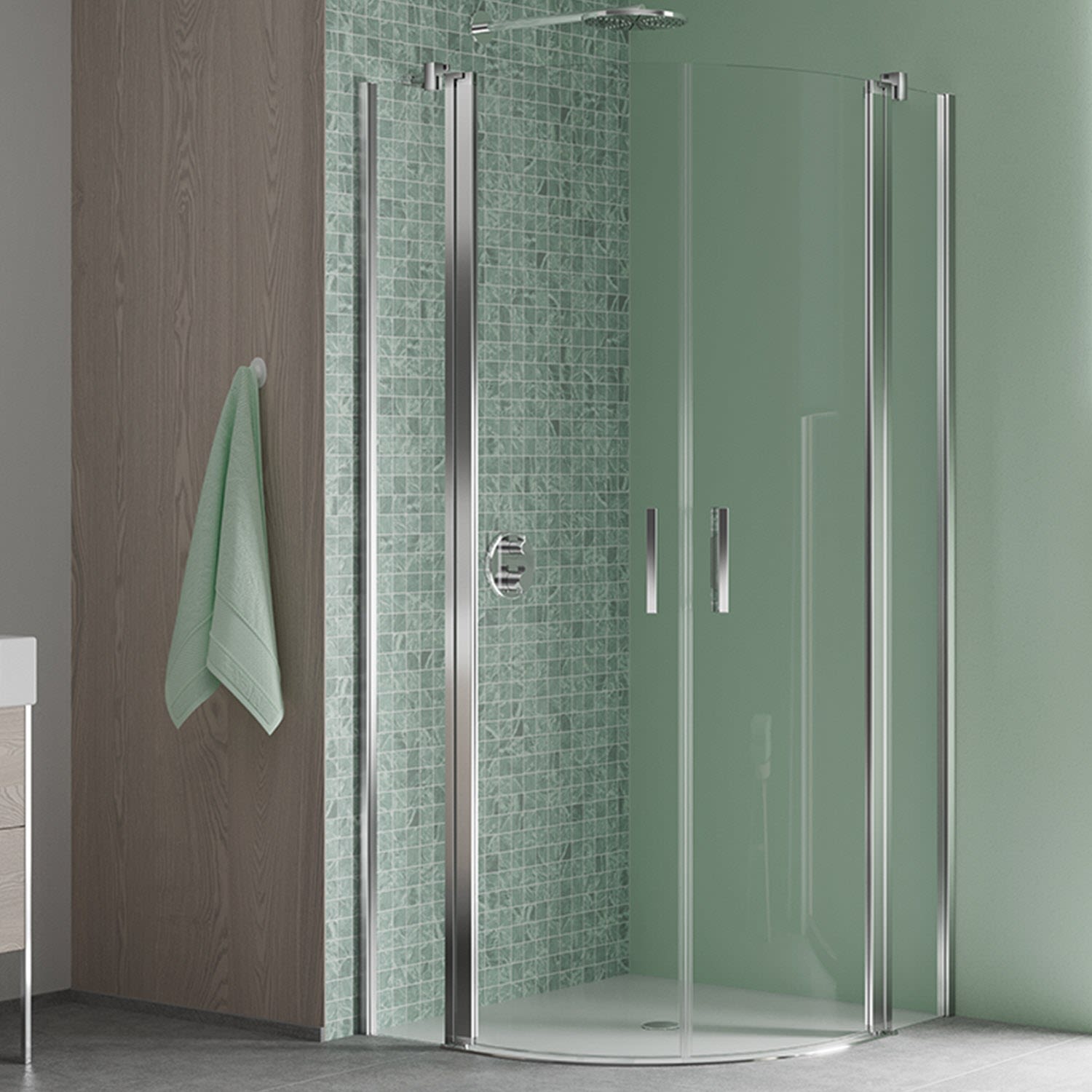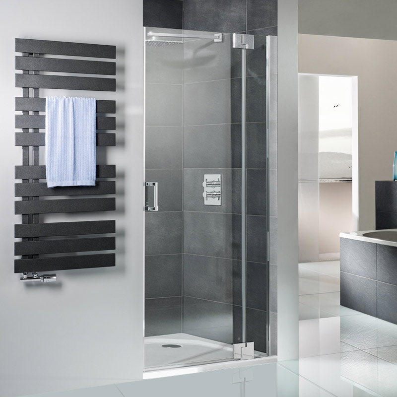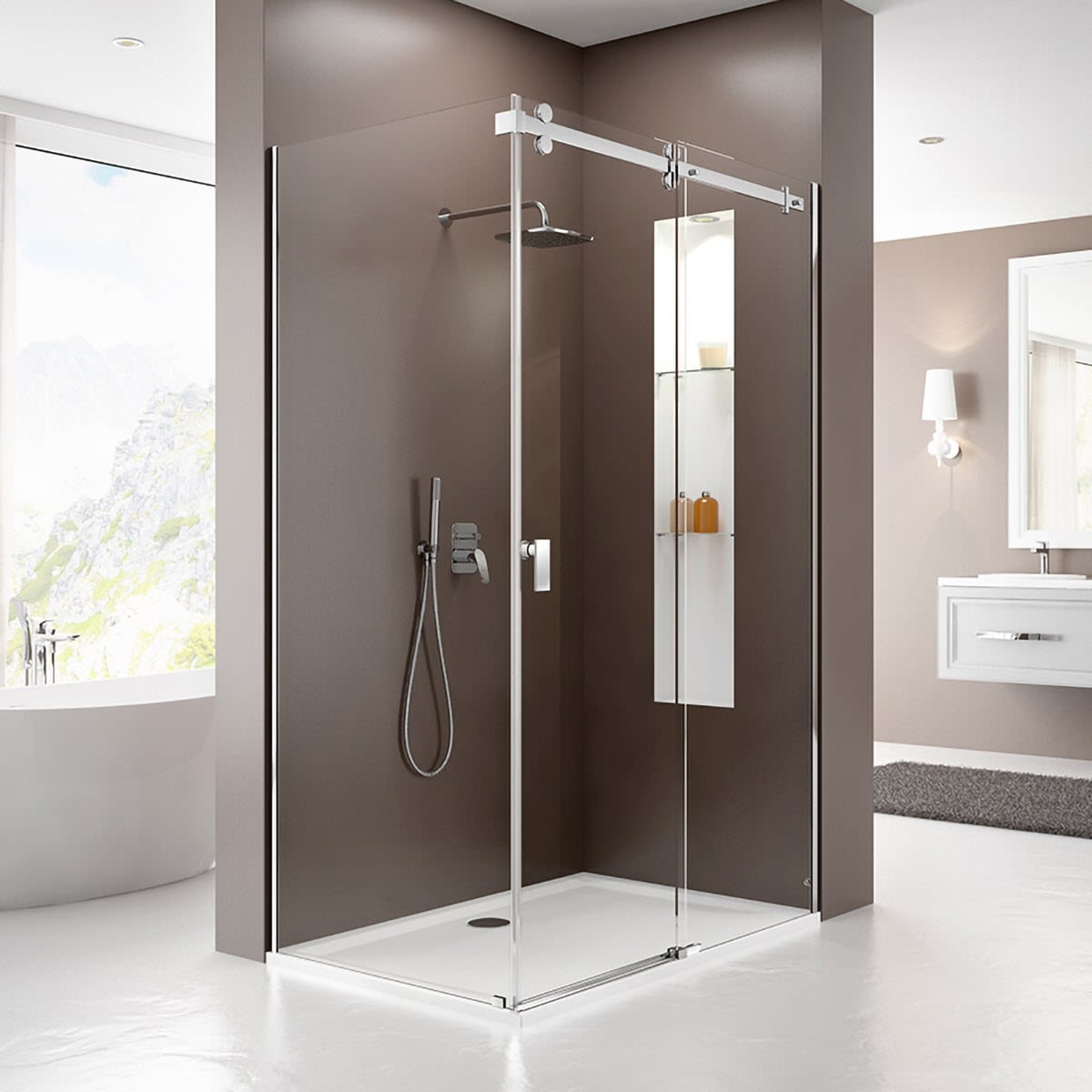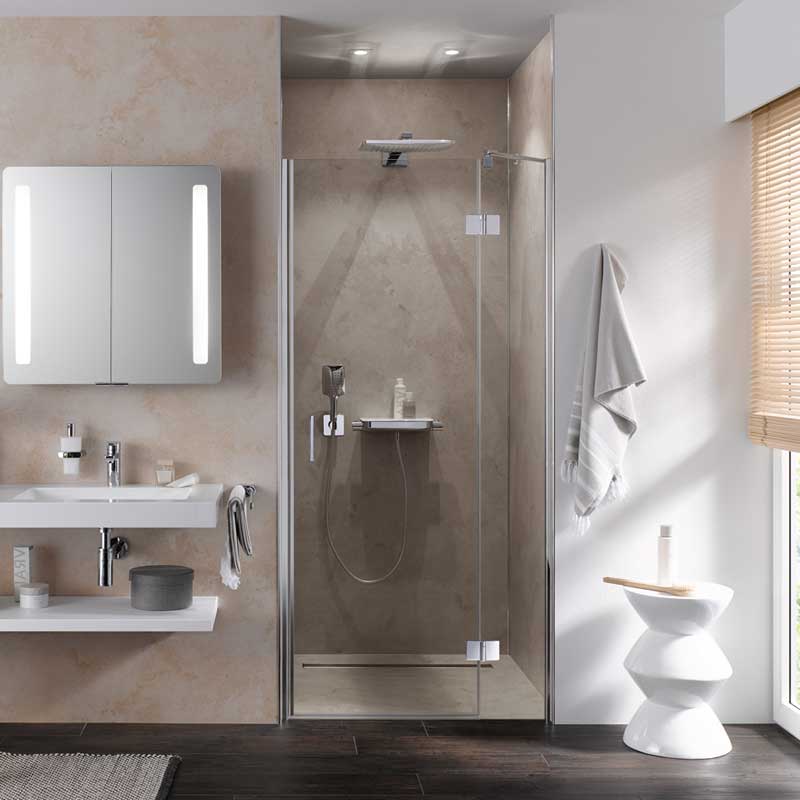 HSK teilgerahmte Drehfalttür pendelbar „Exklusiv 2.0“ für Seitenwand Glas Nebel, Profile Chromoptik (Alu Hochglanz poliert), Scharniere Premium