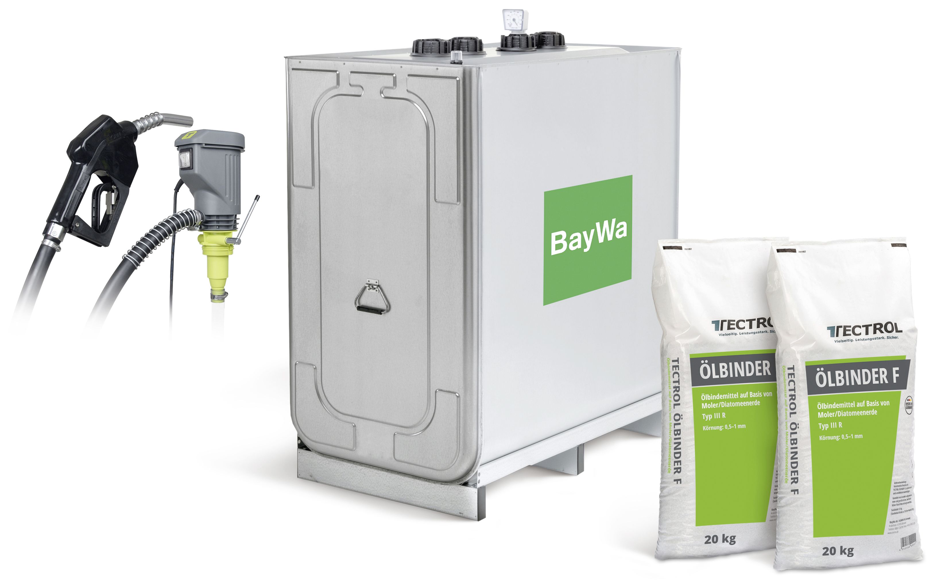 BayWa Hoftankstelle mit 1.000 L Unitech Tank, Hornet W40 A Elektro-Pumpe, 2 Säcke Ölbinder F, Dieseltankanlage