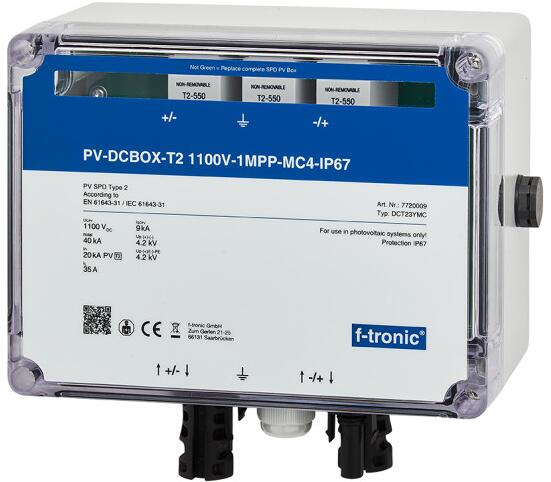 f-tronic DCT13YED Überspannungsschutz-Anschlussbox für PV-Wechselrichter, DC-Seite, Typ 1+2, 1100V, 1 MPPT, mit Einsteckdichtung, IP65, grau (7720006)