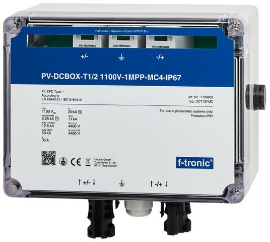 f-tronic DCT15YMC Überspannungsschutz-Anschlussbox für PV-Wechselrichter, DC-Seite, Typ 1+2, 1100V, für 2 MPPT, mit MC4-Steckverbindern, IP67, grau (7