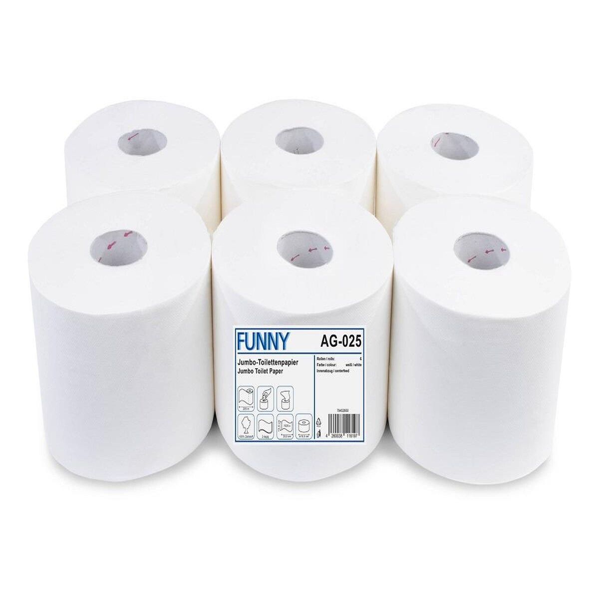 Plock GmbH Jumbo Toilettenpapier FUNNY - 2- lagig - weiß - 6 Rollen - Centerfeed