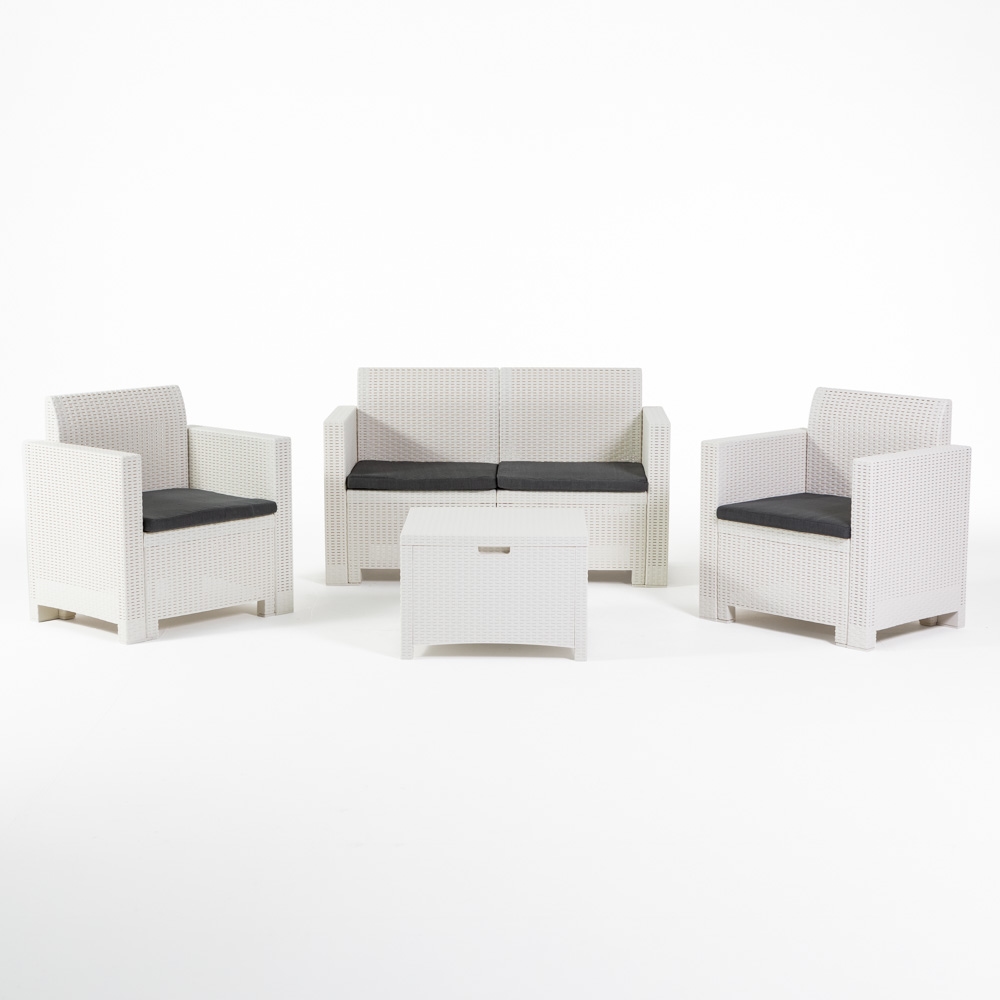 RATTATAN Gartenlounge SALINA aus Polyrattan mit abnehmbaren Kissen, bestehend aus einem 2-Sitzer-Sofa, zwei Sesseln und einem Aufbewahrungstisch –
