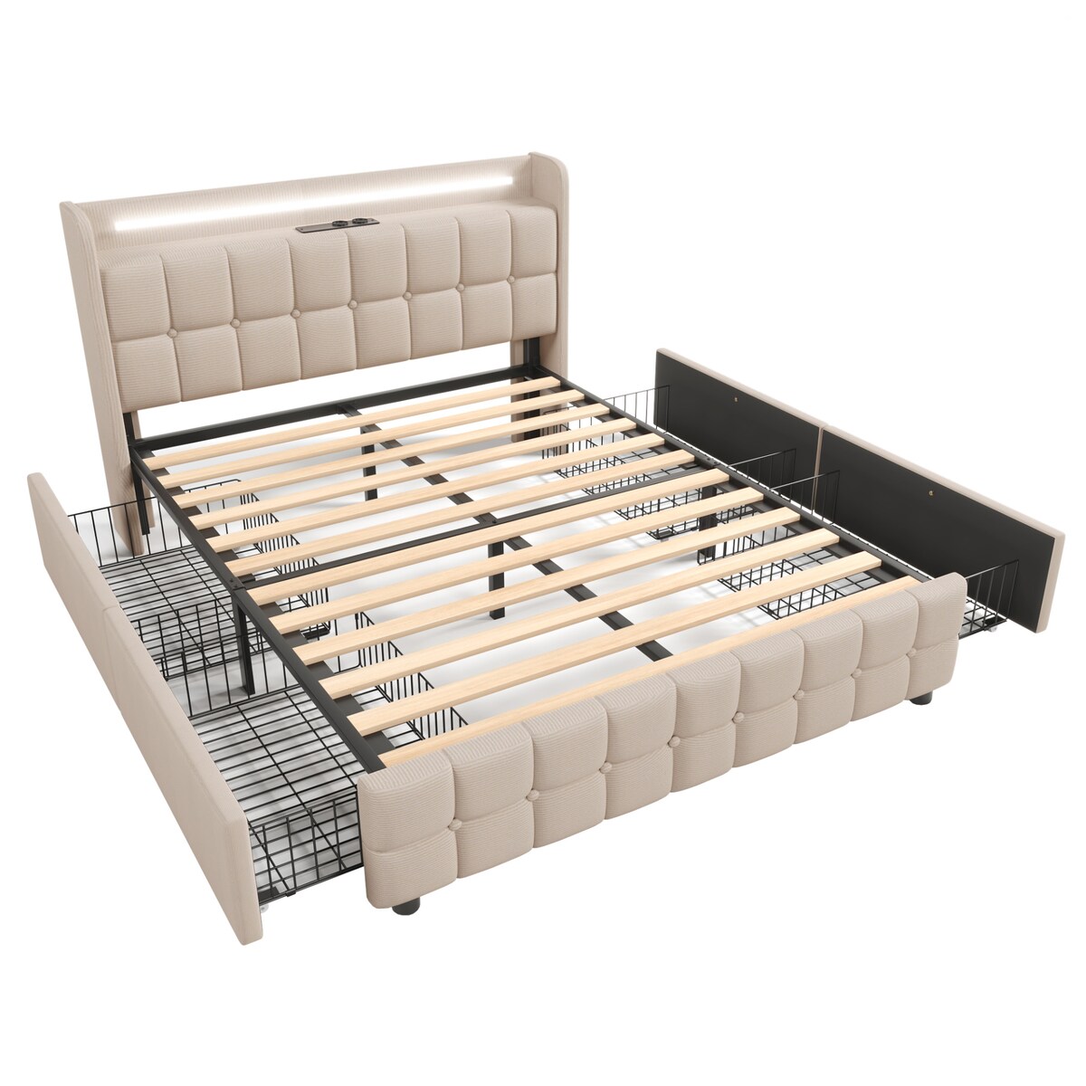 Merax LED Stauraumbett Polsterbett 140x200 Doppelbett aus Leinen mit 4 Schubladen & 2 Steckdosen & 2 USB & Lattenrost Beige