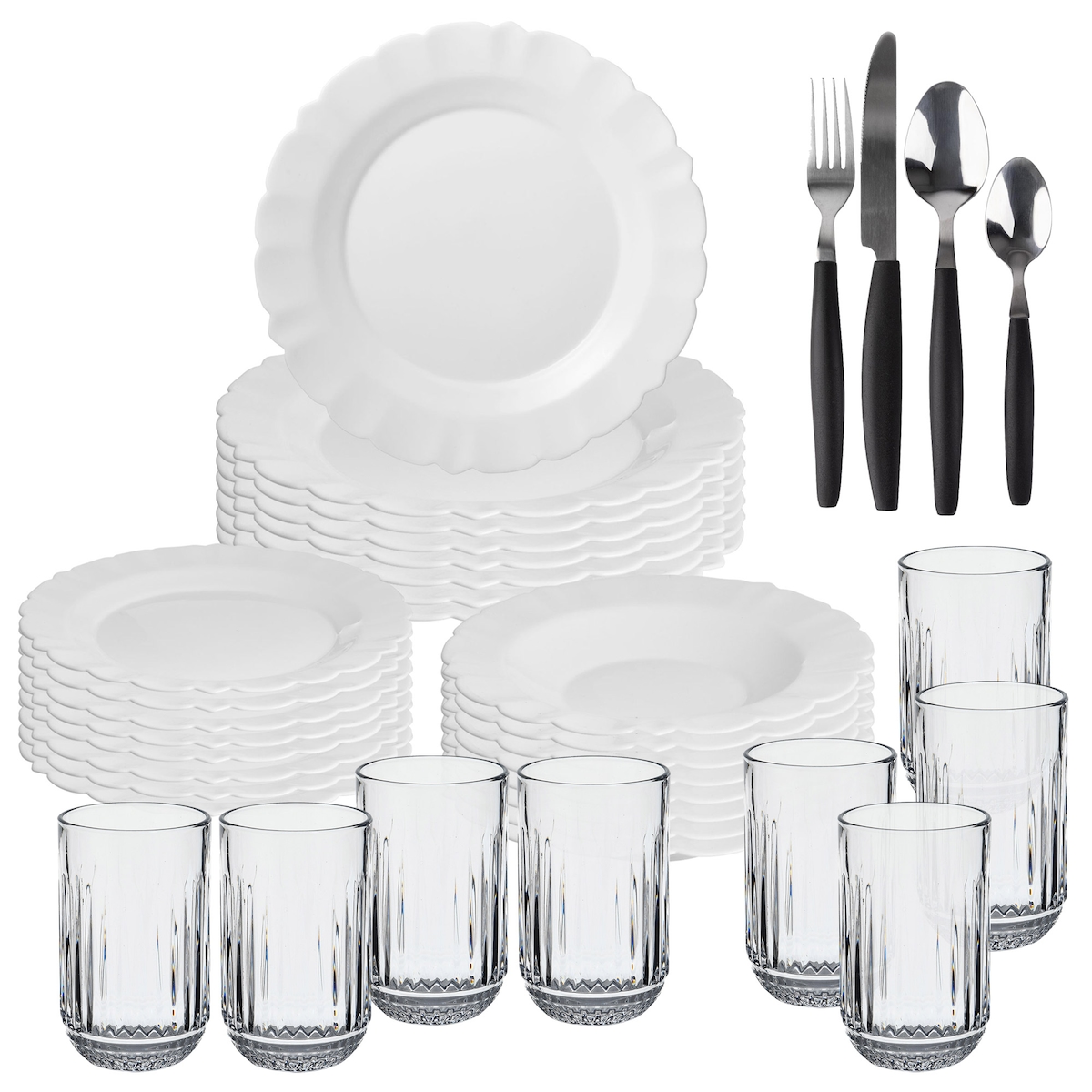 San Ignacio – 24-teiliges Geschirrset Weiß mit 8 Kristallgläsern à 380 ml und 32-teiligem Besteckset aus schwarzem Edelstahl