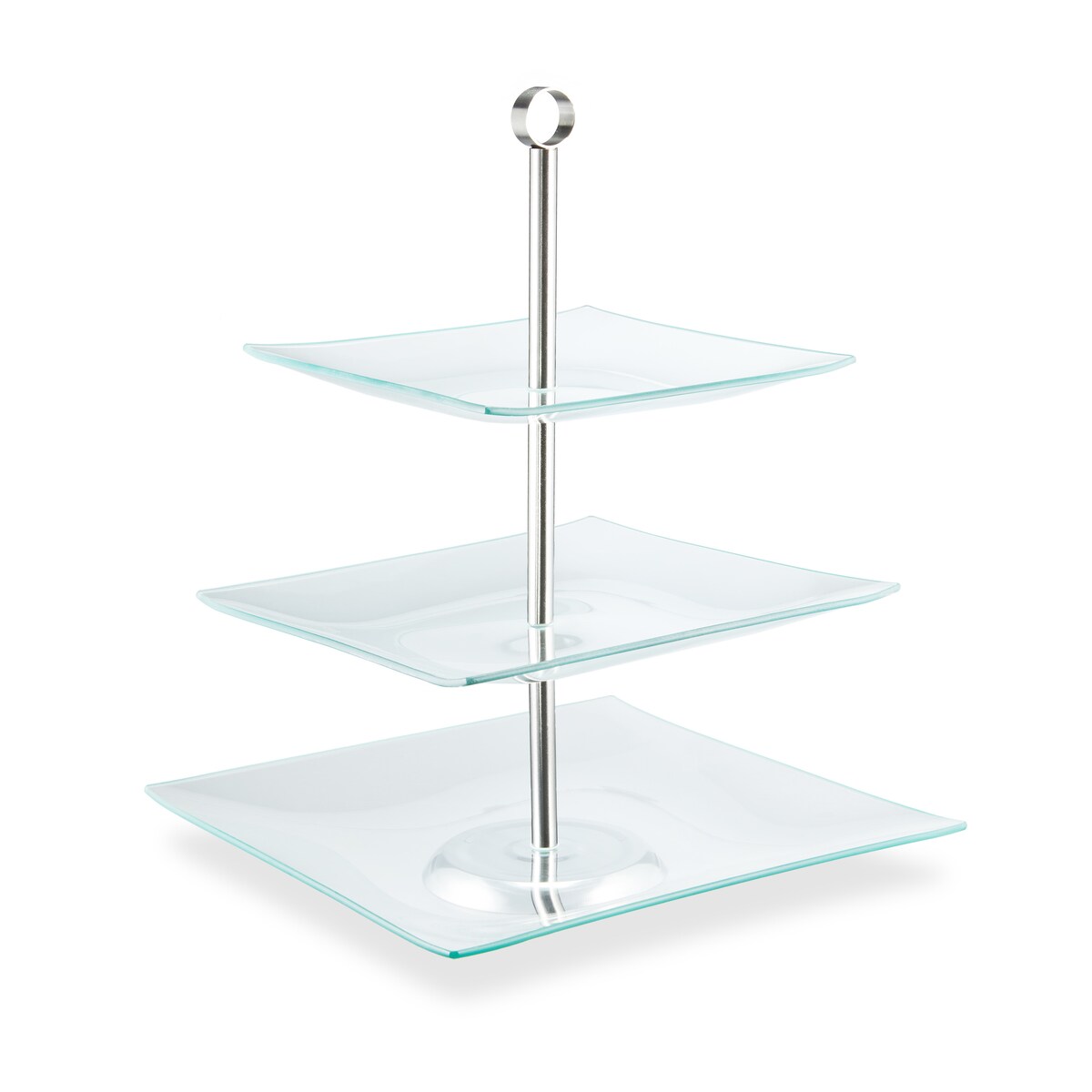 Relaxdays Etagere, 3-stöckig, eckig, Cupcakes, Kekse, Snacks, Obst, Glas, Edelstahl, Servierständer, transparent/silber
