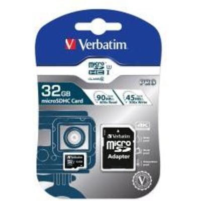 Verbatim microSDHC-Card 32GB, PRO, U3, UHS-I, 4K UHD 90MB/s, (W) 45MB/s, SD Adapter, Retail-Blister