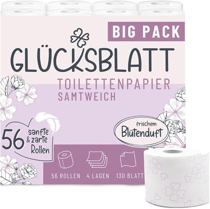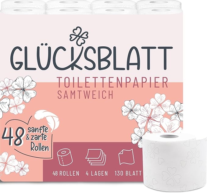 Glücksblatt Toilettenpapier SAMTWEICH, 4-lagig, 48 Rollen x 130 Blatt, 100% Zellstoff, superweiches Klopapier mit Glücks-Prägung