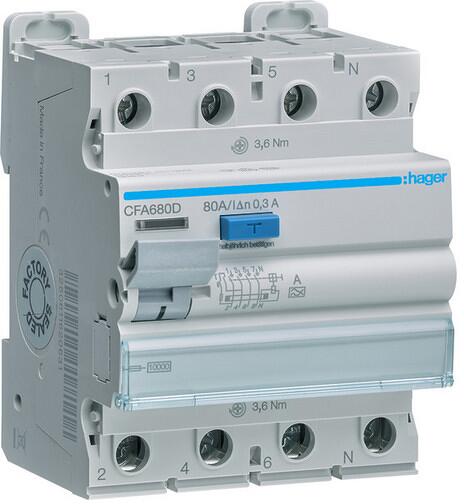 Hager CFA680D Fehlerstromschutzschalter, FI-Schalter 4 polig 10kA 80A 300mA Typ A