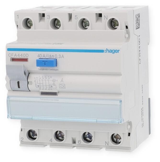 Hager CFA440D Fehlerstromschutzschalter, FI-Schalter 4-polig 6kA 40A 300mA Typ A