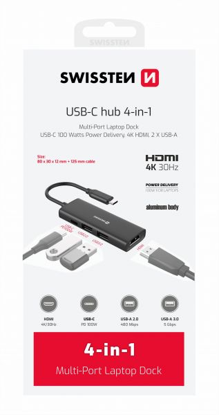 Swissten USB-C HUB 4-IN-1 (USB-C 100W, HDMI 4K, 2x USB-A) Aluminium - Swissten