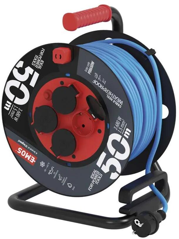 EMOS Outdoor-Kabeltrommel aus Stahlblech, 50m Gummi-Kabel H07RN 1,5 mm2, 4 Schuko Steckdosen, IP44 wasserdicht, P19223