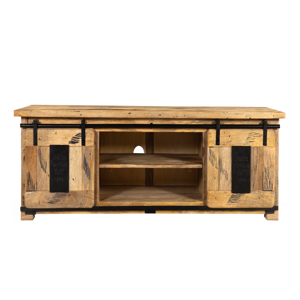 TV Lowboard Garda im Landhaus-Stil, für Fernseher bis 55 Zoll, Massivholz Mango und Metall. 145x35x47 cm | Kadima Design