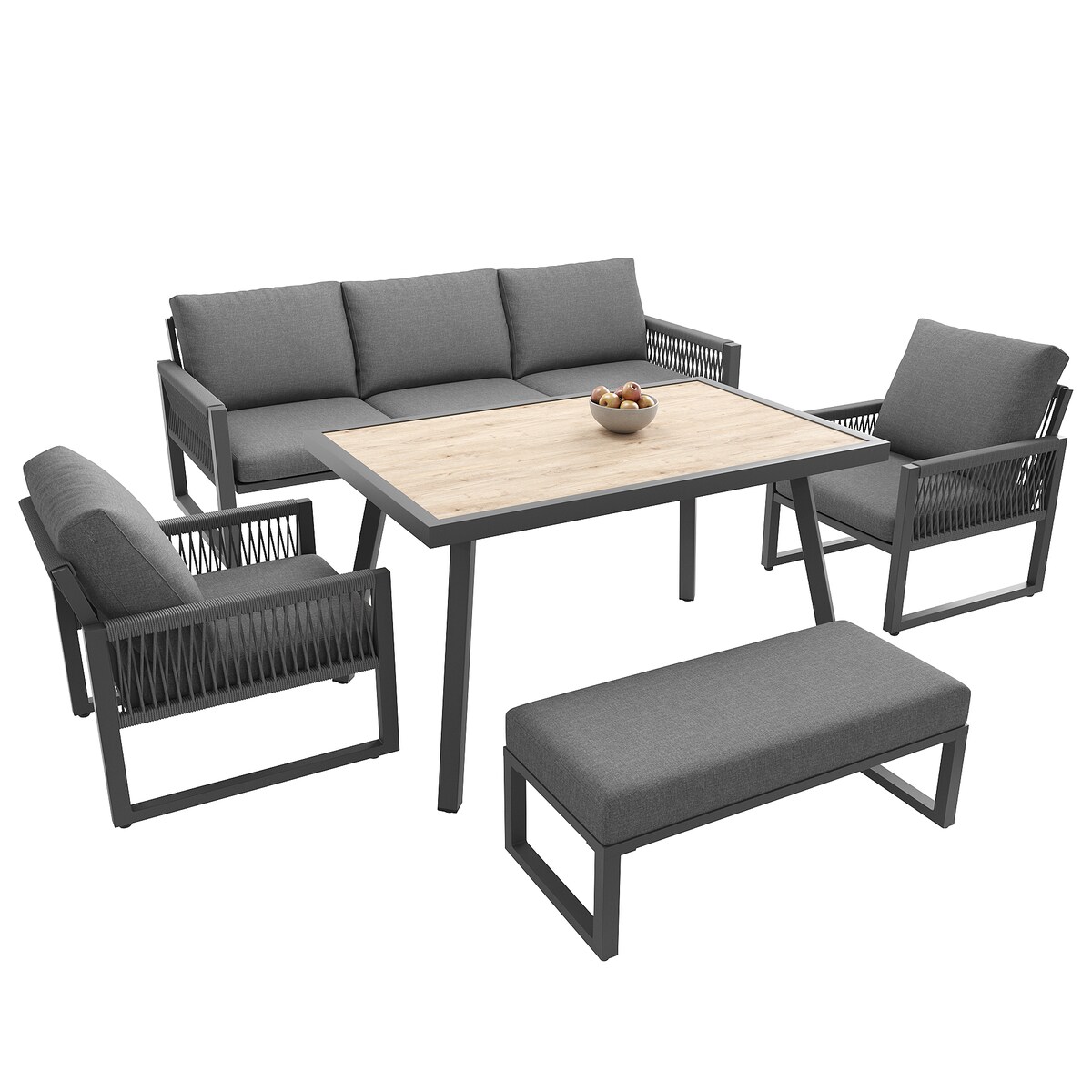 okwish Gartenlounge Set Outdoor Sofa 6 Sitzer,Geflochtenes Seil Pflegeleichte Kissen Tisch Holzoptik Große Ablagefläche Balkon Terrasse Metall Grau