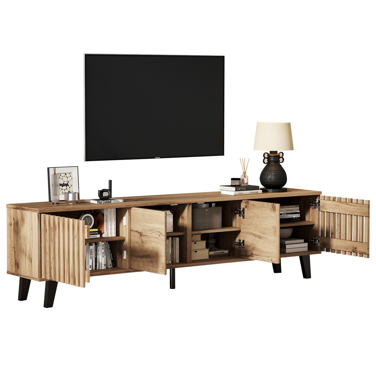 TV-Schrank,TV-Boards Aufbewahrungsfunktionen,offener Stauraum mit Leiterfächern, bietet Platz für bis zu 70-Zoll-TVs