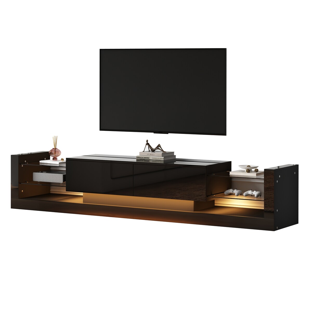 okwish Hochglanz-TV-Schrank mit LED-Beleuchtung, 181 cm – Für Fernseher bis 80 Zoll, Glasfront, zwei klappbare Schubladen, Schwarz