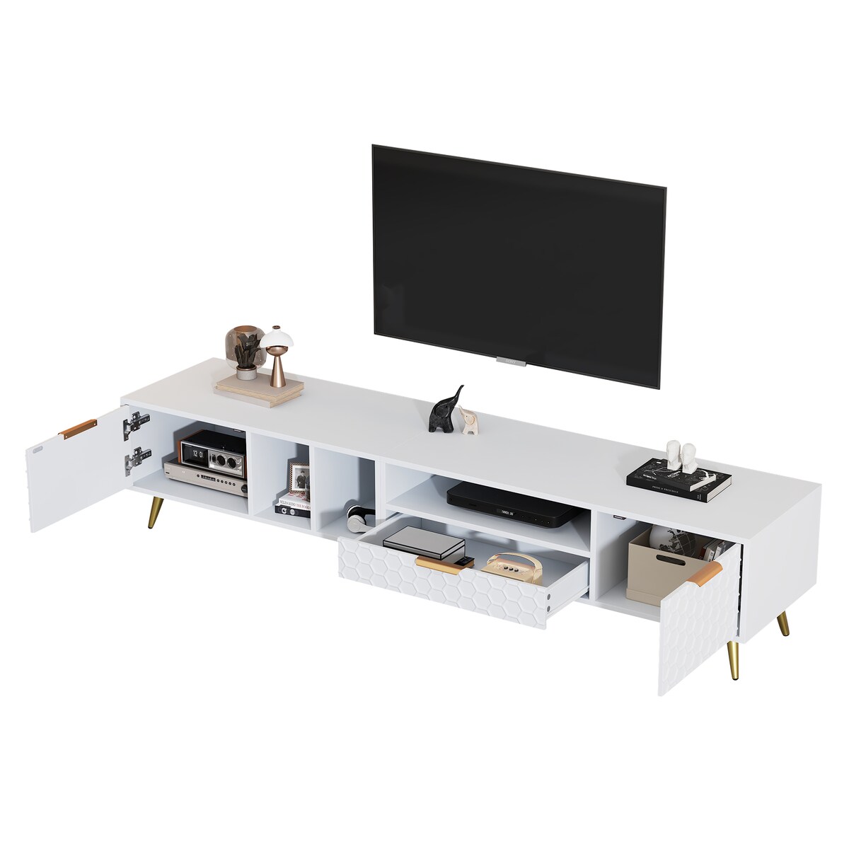 Moderner TV-Ständer in Weiß mit mattem Wabenmuster, goldenen Füßen und Griffen – viel Stauraum für Fernseher bis 80 Zoll, 180 x 40 x 41 cm