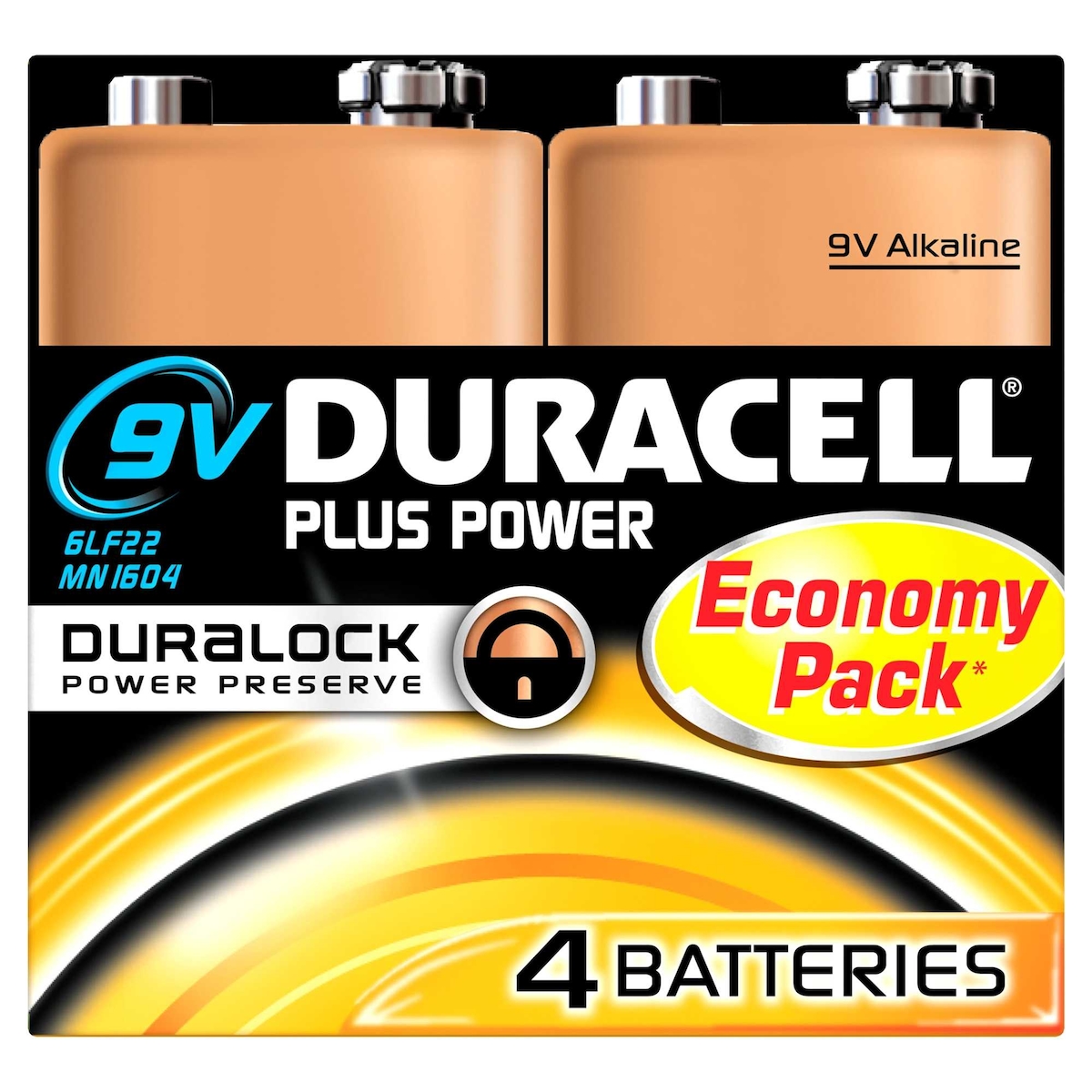 Duracell Batterie Alkaline, E-Block, 6LR61, 9V Plus, Extra Life, Retail Blister (4-Pack)