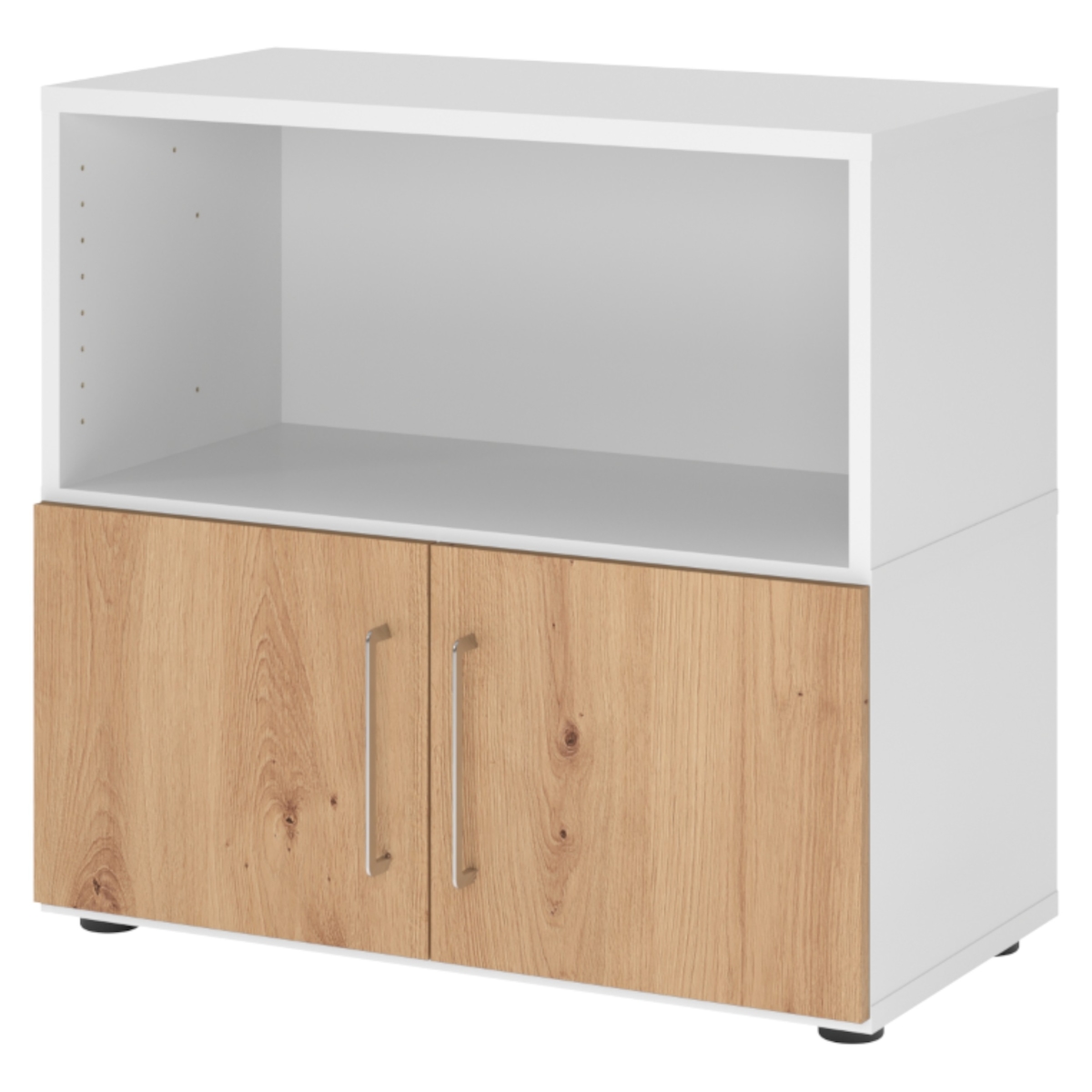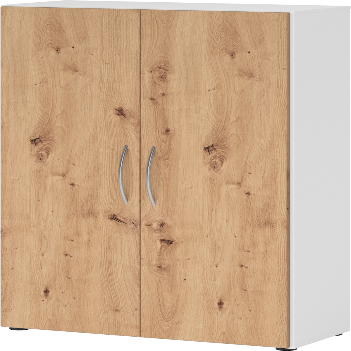 bümö flexi Aktenschrank klein mit Flügeltüren & 1 Regalfach in Weiß/Asteiche, Büroschrank mit werkzeuglosem Schnellmontage-Klicksysten in modularer