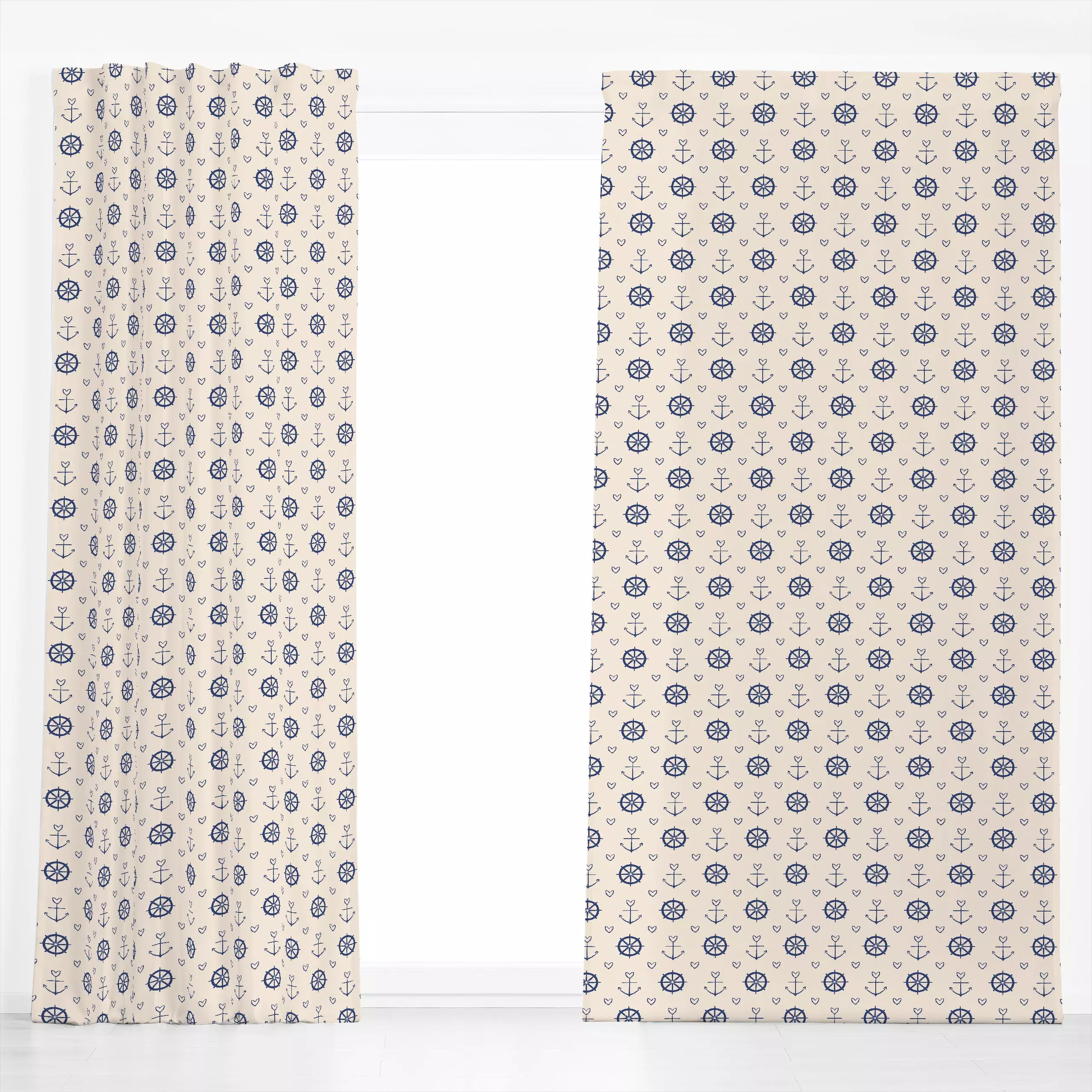 Dekovorhang Anker und Herz Beige Blau - Sommer, Symbole & Muster - von „Mareen Heinz"; abstrakt, Meer, Sand, Herzen, beige, ...