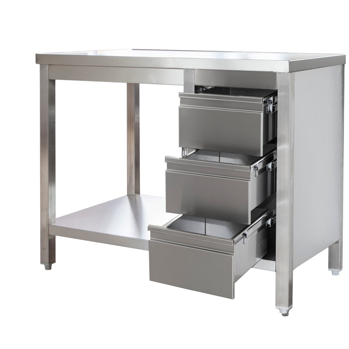 Stalgast Edelstahl Arbeitstisch ohne Grundboden, 1200x600x850 mm, mit 3er Schubladenblock rechts, ohne Aufkantung, verschweißt