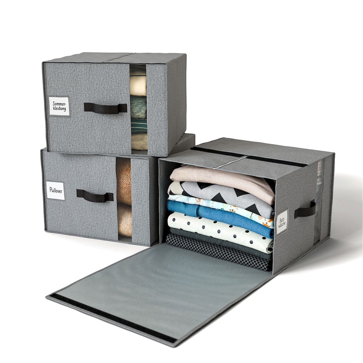 Björn&Schiller Aufbewahrungsboxen für Kleidung – 3er Set, 39×36×26 cm, 37 L, Leinenstoff, Sichtfenster, Fixiergurte, Grau