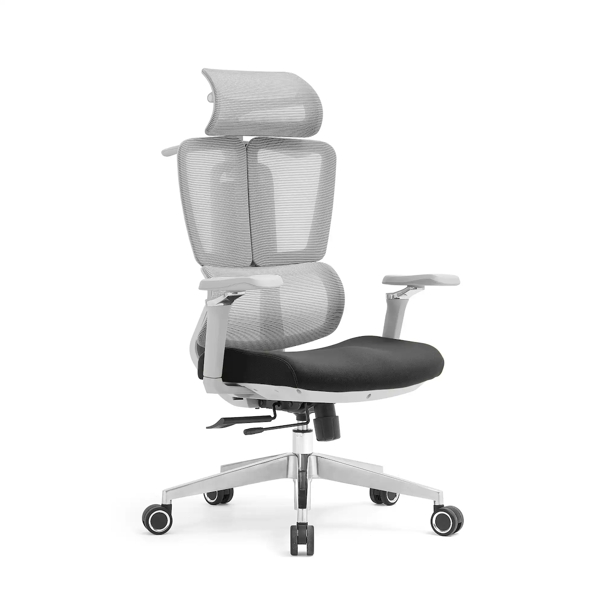 STEELBOXX Bürodrehstuhl mit Kopf- Nackenstütze und 5D Armlehnen, 3D geteilter Netzrücken, Lordosenstütze, grau/schwarz