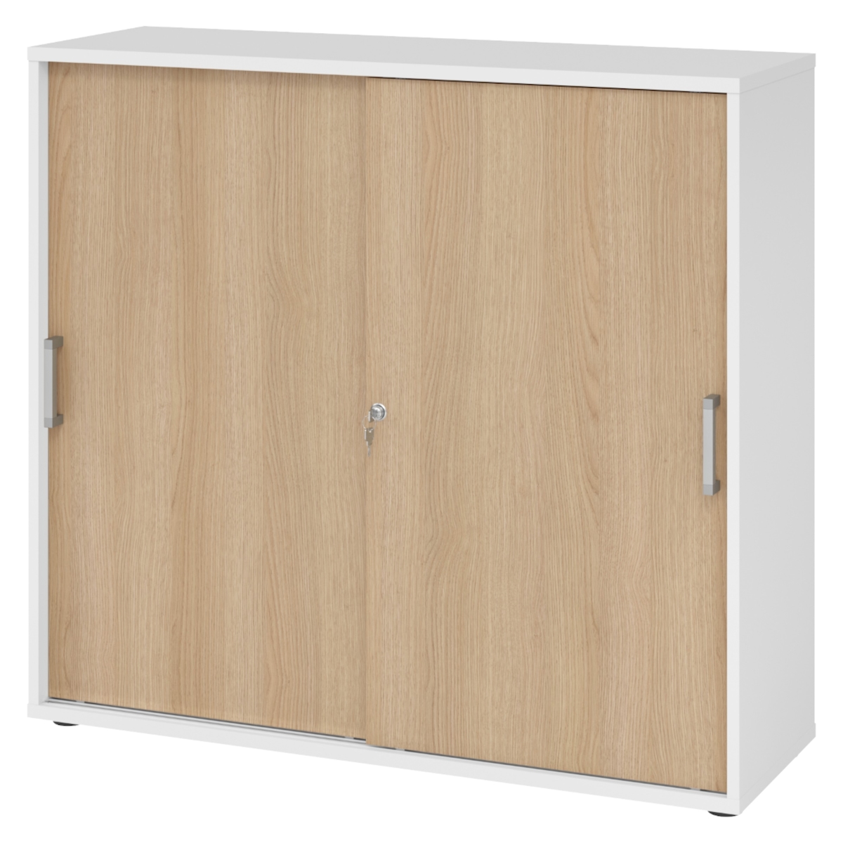 bümö Schiebetürenschrank 3OH - Aktenschrank abschließbar, Sideboard Schrank mit Schiebetüren in Weiß/Eiche, Chromgriff - Büroschrank aus Holz mit