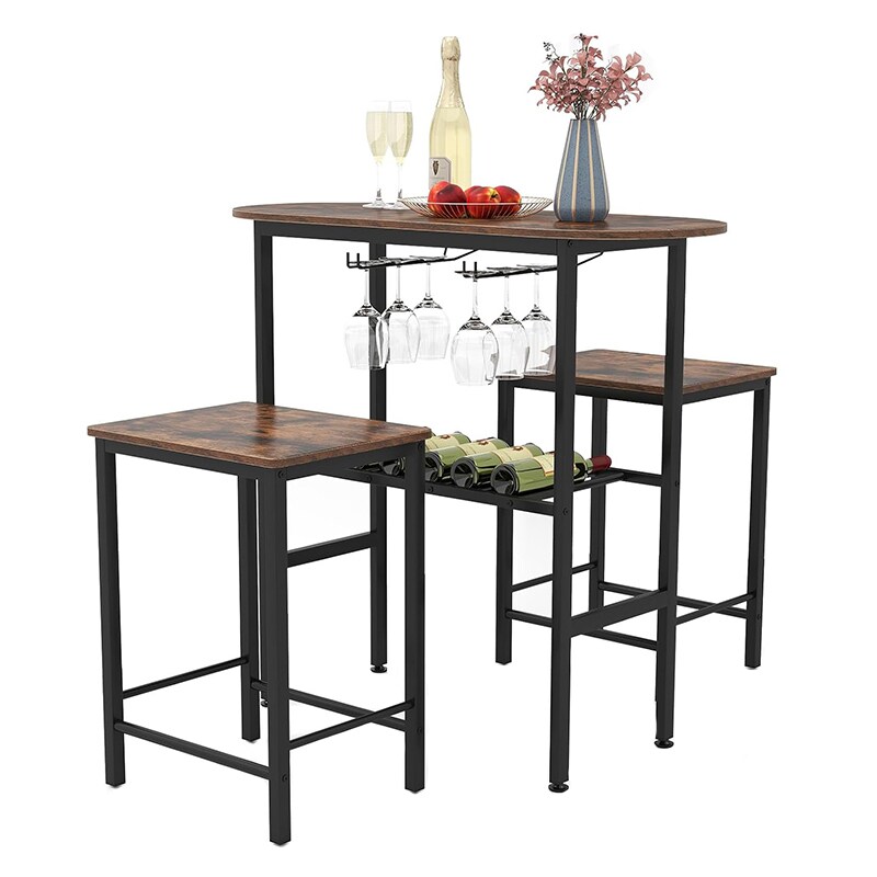 COSTWAY Bartisch mit Barhocker-Set, Bartisch-Set für 2 Personen mit Halterungen für Weingläser und Flaschen