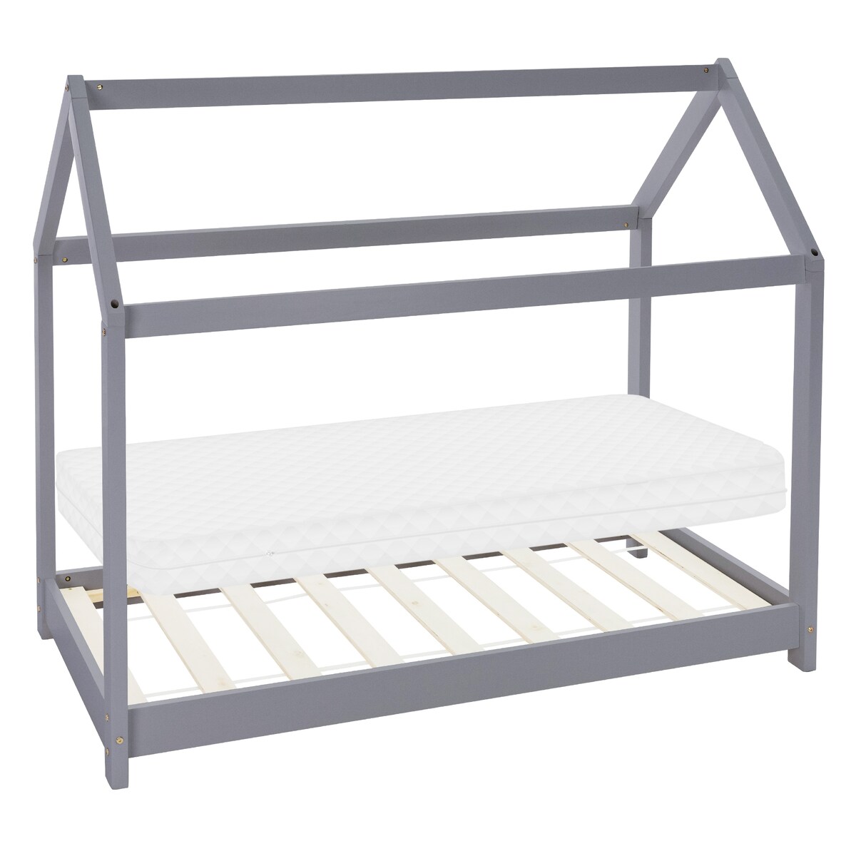 ML-Design Kinderbett 70x140 cm Hellgrau mit Matratze, Dach & Lattenrost, Hausbett aus Kiefernholz, Kinderhaus Bodenbett Spielbett Jugendbett