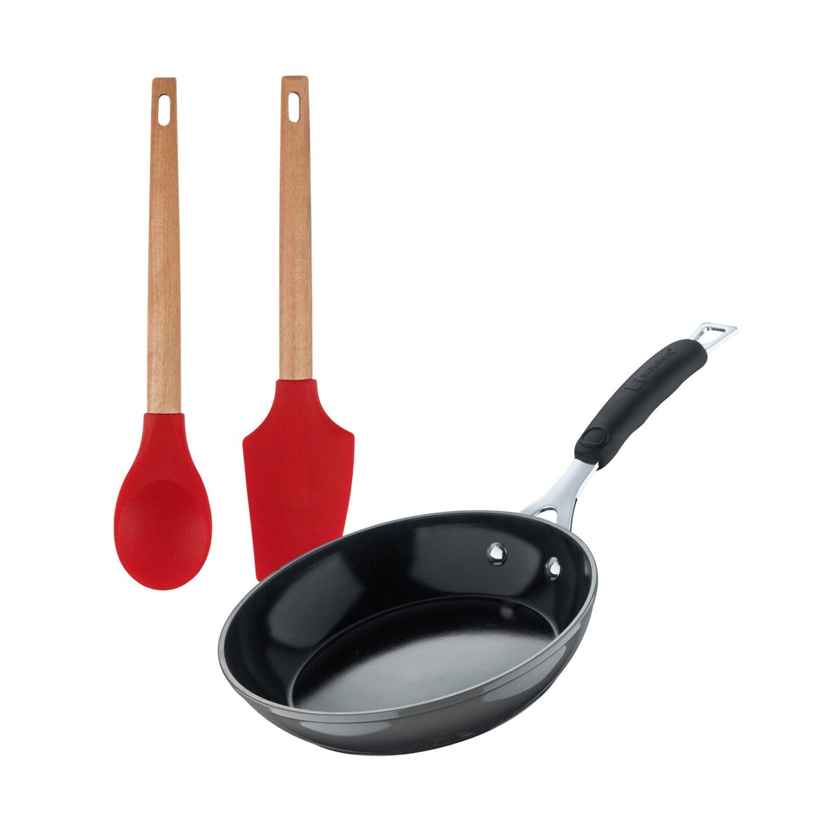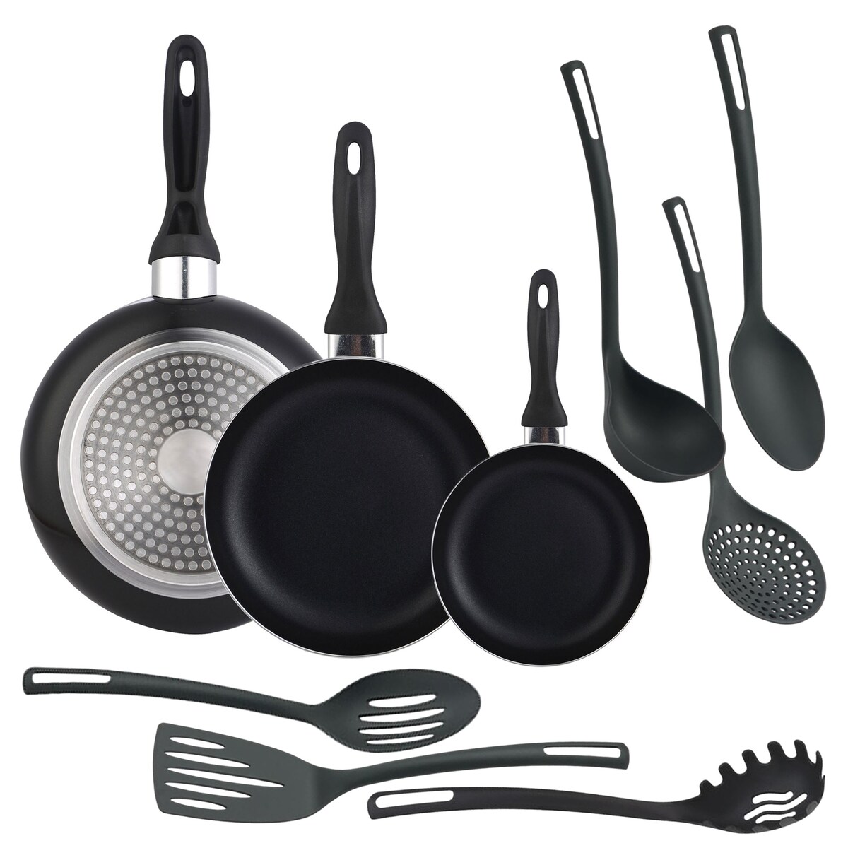 WellHome - 3er-Set Bratpfannen Ø16/20/24cm aus schwarzem Pressaluminium mit 6er-Set PBT-Küchenutensilien