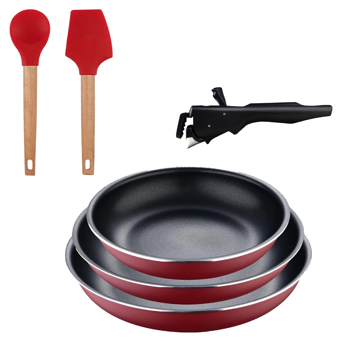 BERGNER - Set mit 3 Bratpfannen Ø18/20/24cm aus gepresstem Aluminium, rot, mit abnehmbarem Griff mit 2-teiliges Küchenutensilien-Set EXCALIBUR