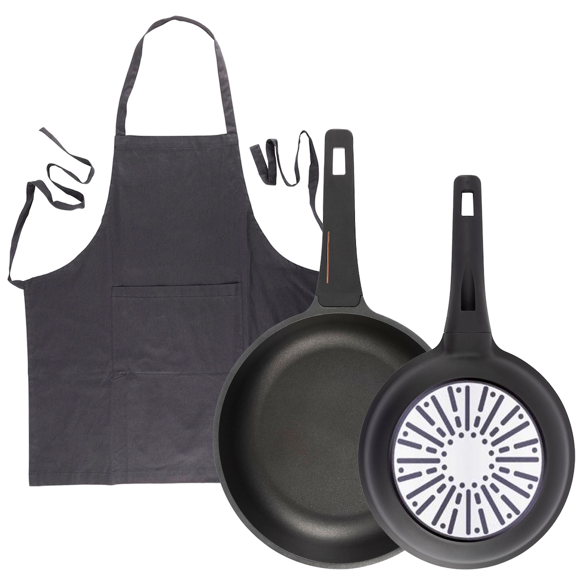 BERGNER - Set mit 2 Bratpfannen Ø24/28cm aus Aluminiumguss mit Bakelitgriff mit Küchenschürze Dunkelgrau 100 % Baumwolle 75x80 cm