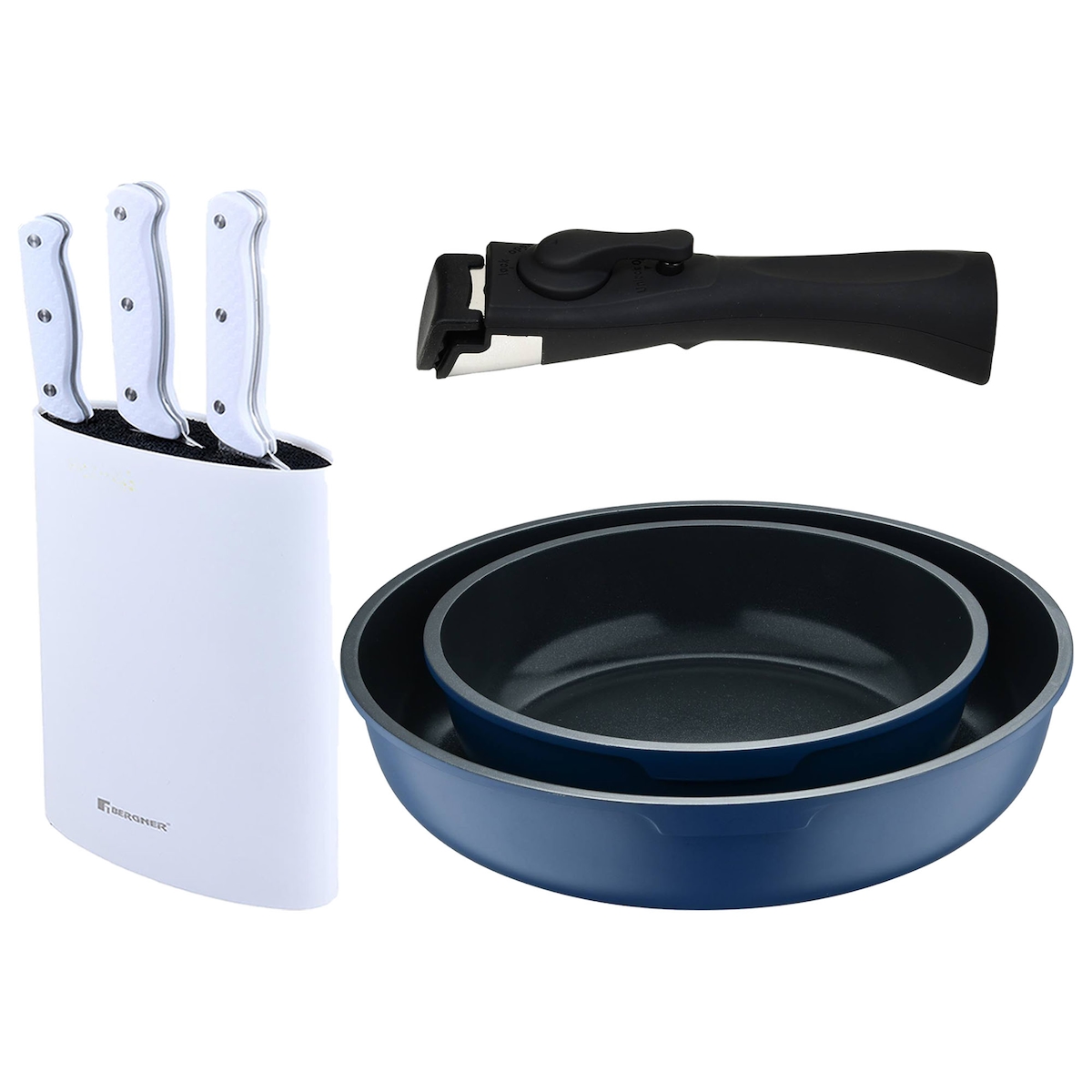 BERGNER - Set mit 2 Bratpfannen Ø22/26cm aus Aluminiumguss, blau, mit abnehmbarem Griff mit 3-teiliges Messer-Set mit Messerblock aus Edelstahl