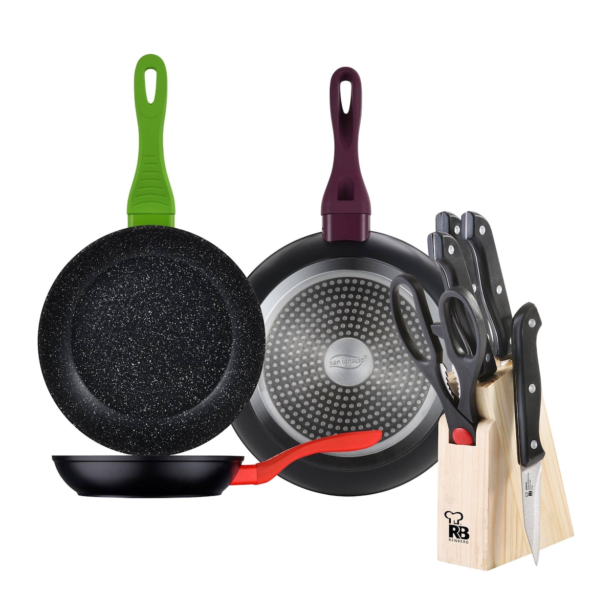 San Ignacio - Set mit 3 20/24/28 cm großen Bratpfannen aus gepresstem Aluminium für Induktion mit Utensilienset und Daimiel-Messersets