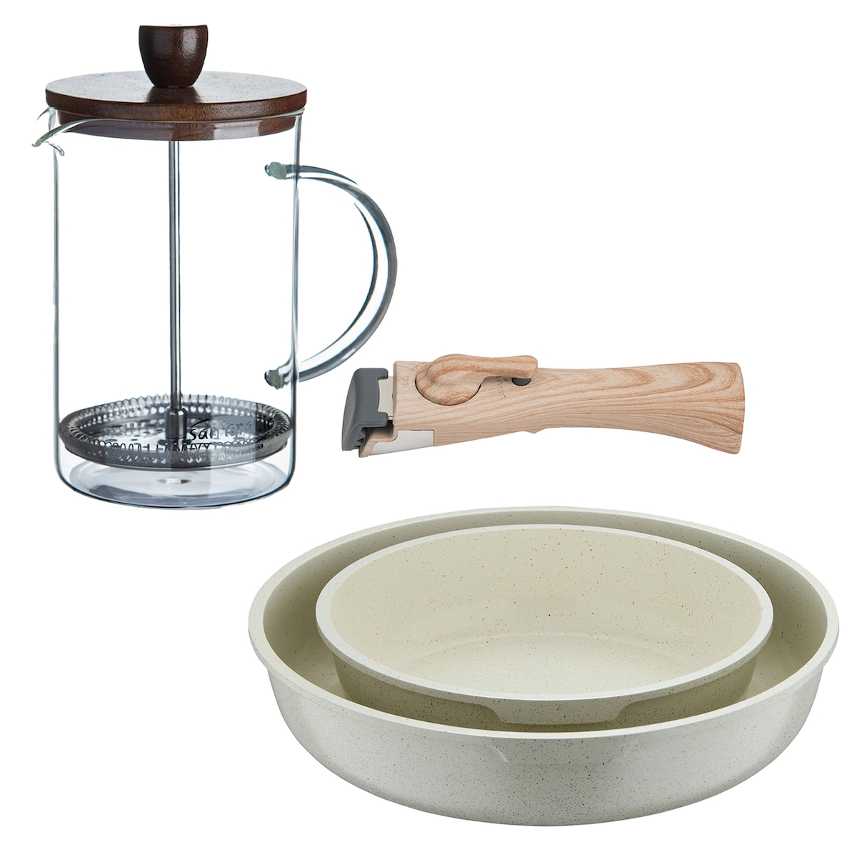 BERGNER - Set mit 2 Bratpfannen Ø22/26cm aus Aluminiumguss, weiß, mit abnehmbarem Griff mit Stempel-Kaffeemaschine aus Borosilikatglas 15,8×10×18,8 cm