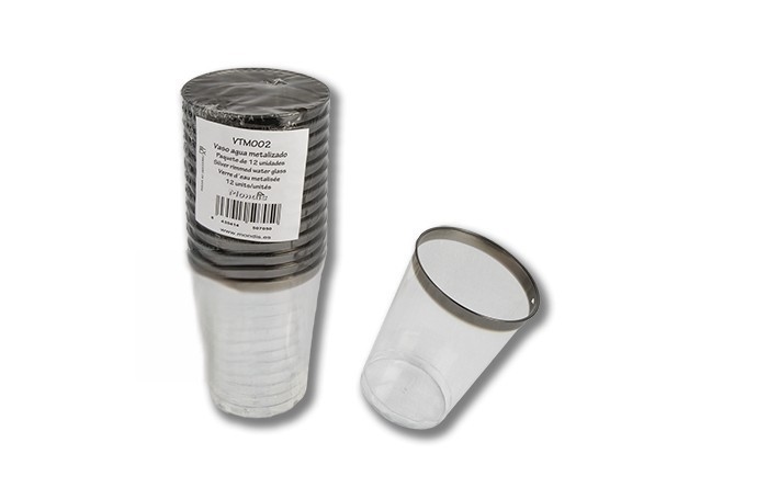 Copo de água em plástico rígido com borda superior em cor metálica. Modelo: VTM002