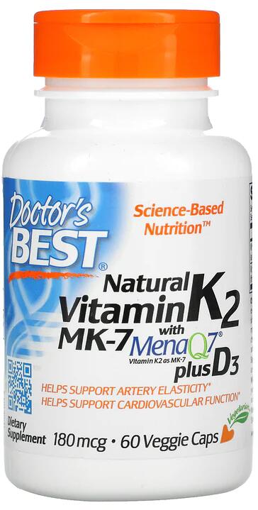 Doctors Best Natural Vitamin K2 MK-7 with MenaQ7 plus D3 - 180 mcg, 60 Kapseln